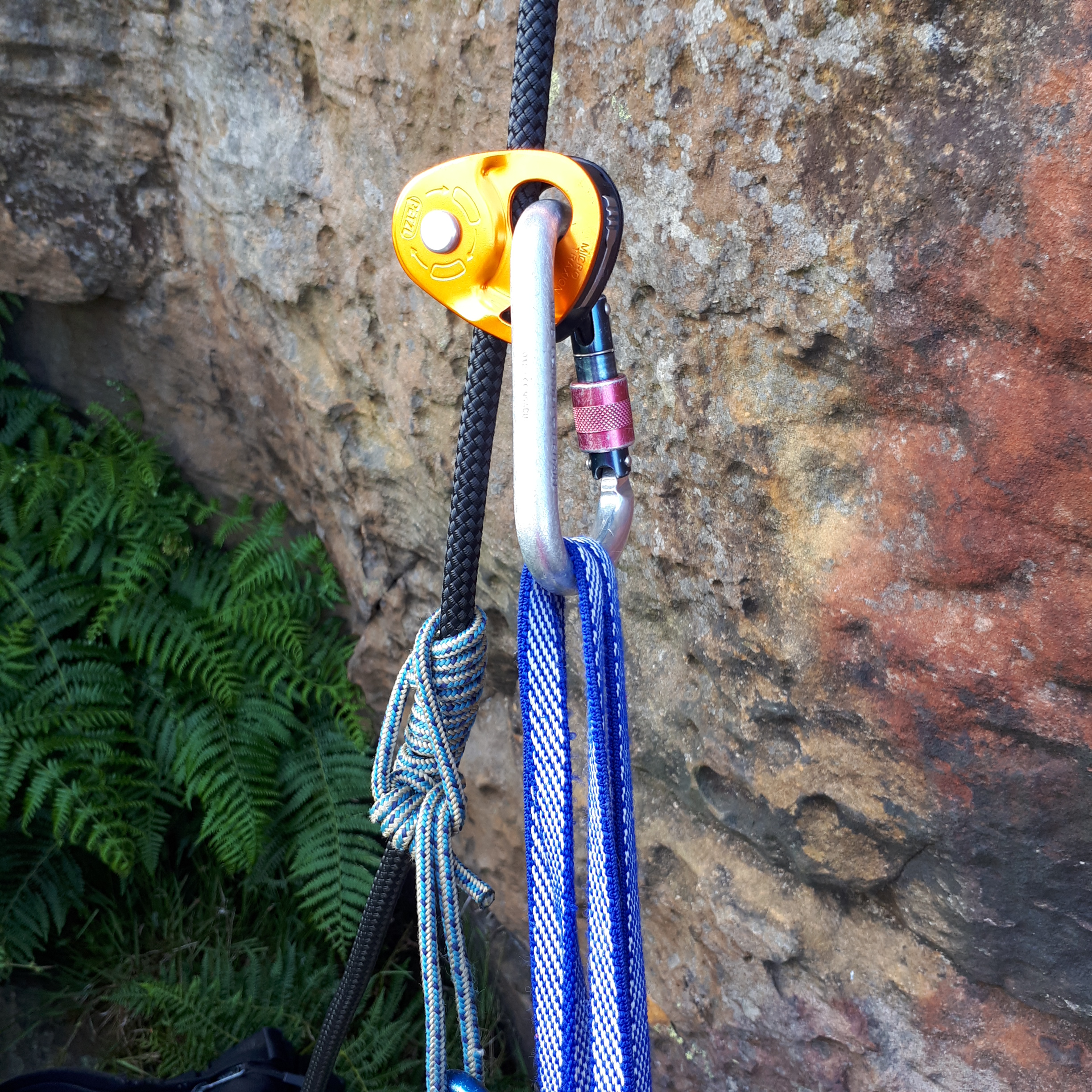 I’d spent the week watching You Tube videos and picking the brains of more knowledgeable climbing friends and I was now the owner of 30 metres of semi-static rope and a Petzl Micro-Traxion ascender. This little device grips the rope in one direction only, so you can slide it easily up the rope but a downwards force will mean it grips the rope tightly. A bit like a prussik knot but stronger, safer, faster and less tiring to use. Most climbing rope is dynamic which means it stretches to absorb the huge forces placed upon it by a lead climber falling. Semi-static rope is low stretch and resistant to abrasion, perfect when you want to hang on a rope but aren’t going to be falling from a great height. All a bit technical and boring until your life depends on it and then it suddenly becomes fascinating……..!