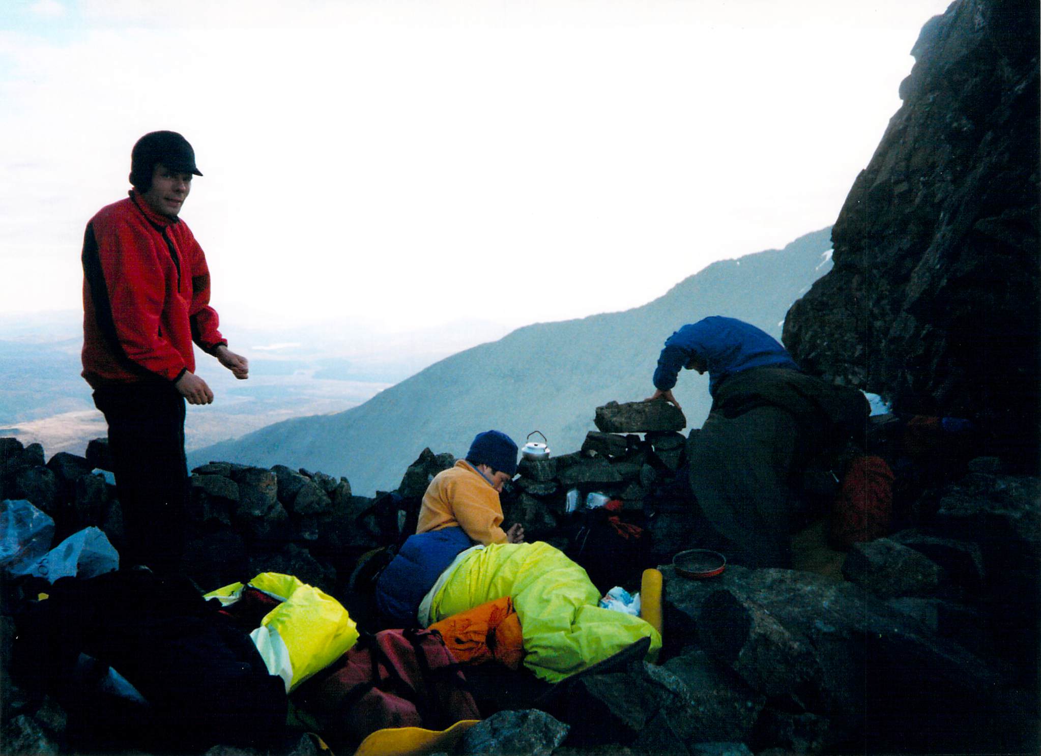 A few hours later we arrived at Coire A Ghrunda, hot, tired and annoyed. It started to drizzle a little. Christ, it wasn’t supposed to rain. We had no tents, only identical illuminous yellow bivvy bags. Apart from Paavo who naturally had Rab gear from head to toe (2020 note – Paavo worked for Rab at the time). So we settled down for the night.