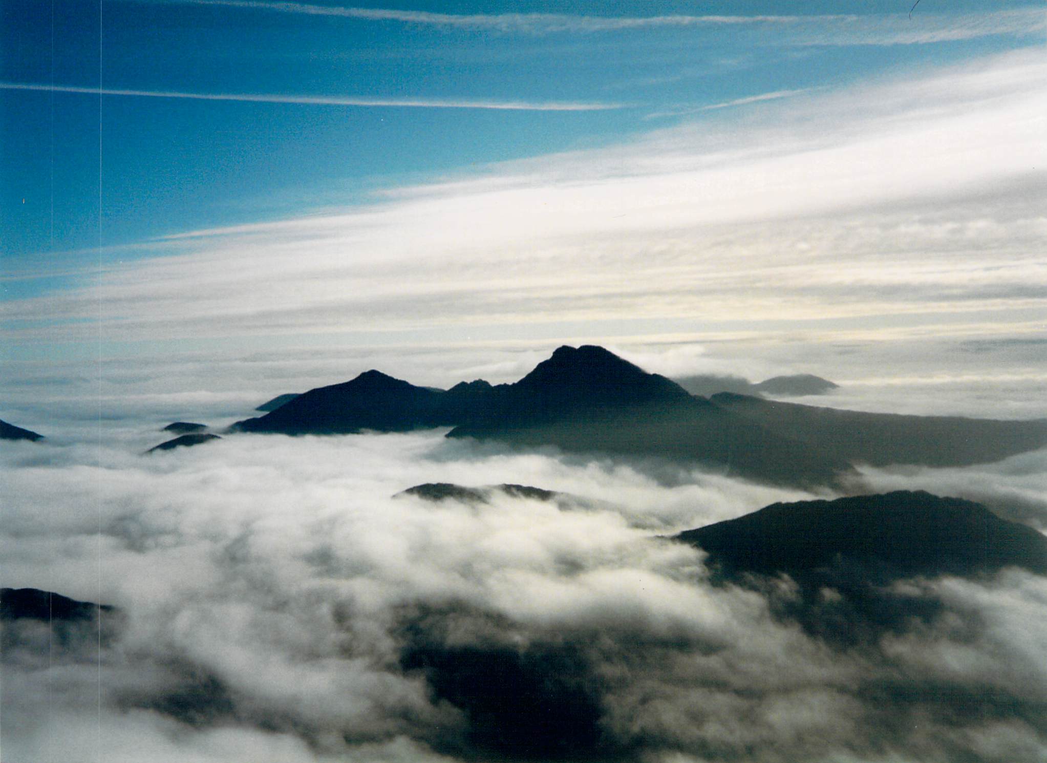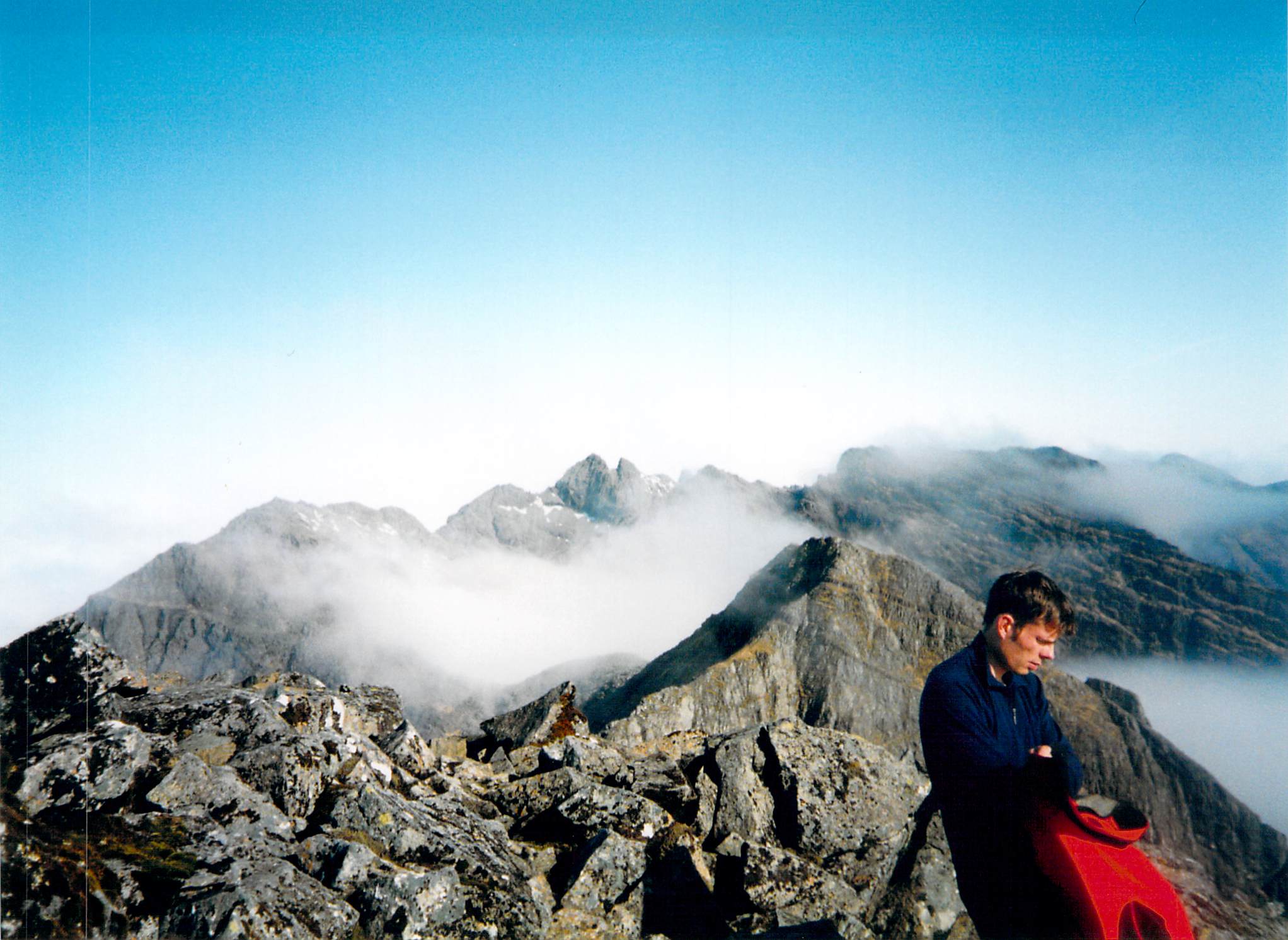 Jim & I started at 7am the next day. Ben and Paavo stayed in bed. There was a nice view over the sea to Rum. Then I put my contact lenses in and realised the sea was actually cloud and we had a cloud inversion with the mountains of Rum poking out of the top. Within 15 minutes of starting I had bashed my head on a rock and given myself a sore head which would last most of the trip. Typically I had left my helmet behind to lighten my rucksack (2020 note – !!!???). We dumped our sacks on the col between Sgurr Nan Eag and Sgurr Dubh Mor and walked to Garsbheinn, right on the end of the ridge. This took longer than expected, but as soon as we got to the end the sun came out and Bla Bheinn was in sight, its twin peaks rising above the cloud inversion.