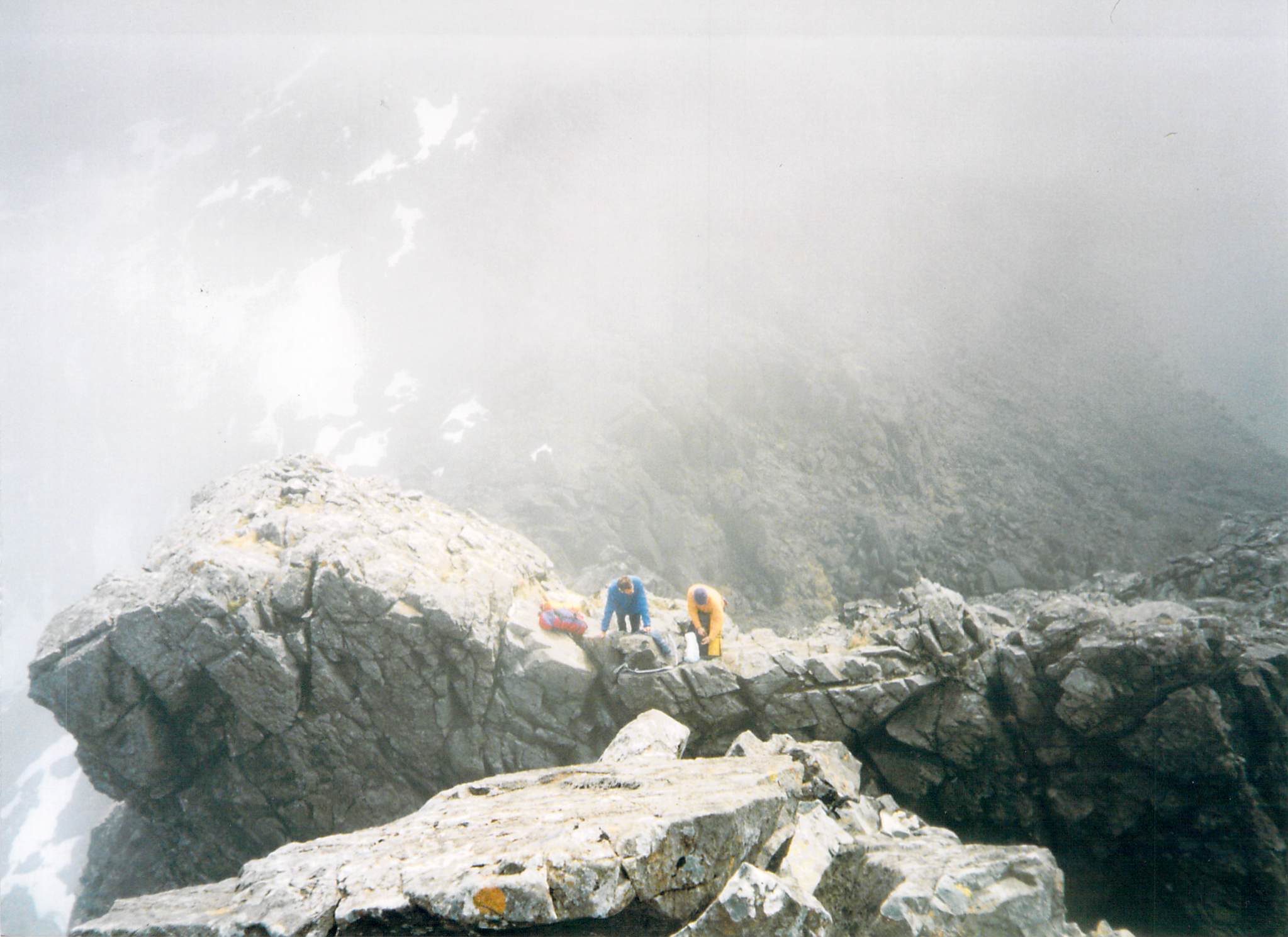 We soon came to the TD gap, at V Diff the most technical part of the ridge. We abseiled down to the gap and looked in horror at the smooth, vertical wall ahead. The cloud had closed in, the gap was dank, dripping and eerily quiet, white mist blowing around. Jim led the wall in rock boots without his sack. Very nice for him. I seconded it in big boots with my sack on. My lungs felt they were at altitude as I gasped for breath after strenuous moves. Ben and Paavo watched us and then followed. Despite watching our struggles, Paavo tried to lead the wall in big boots with a sack – and got stuck. After floundering around and swinging wildly from side to side, he left his sack tied to some gear and continued. Ben then attached Paavo’s sack to his own harness and with his own sack on his back and a cry of “This is how you do it in Yosemite” (in which case I’ll stay away from Yosemite) he climbed the wall to the astonishment of observers.