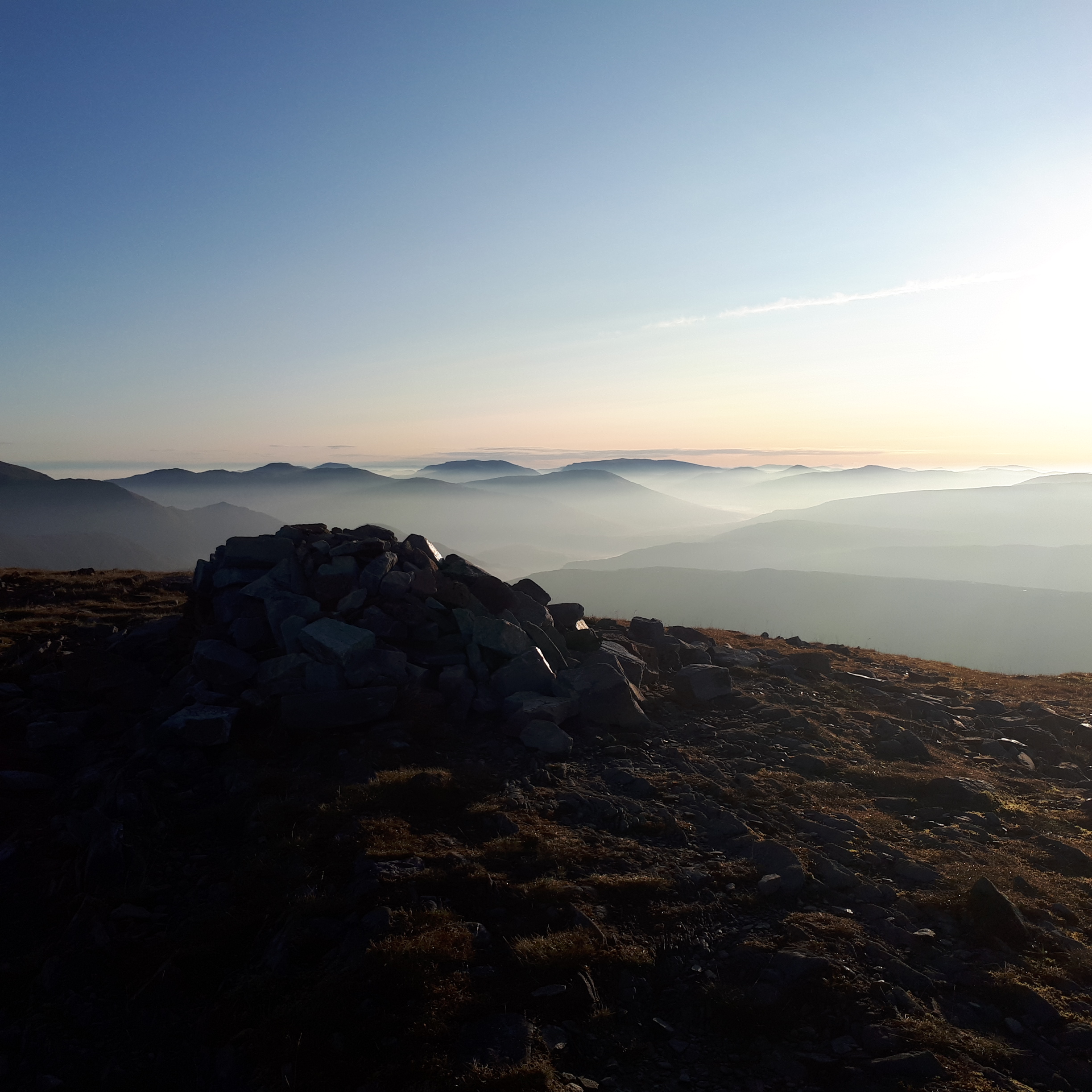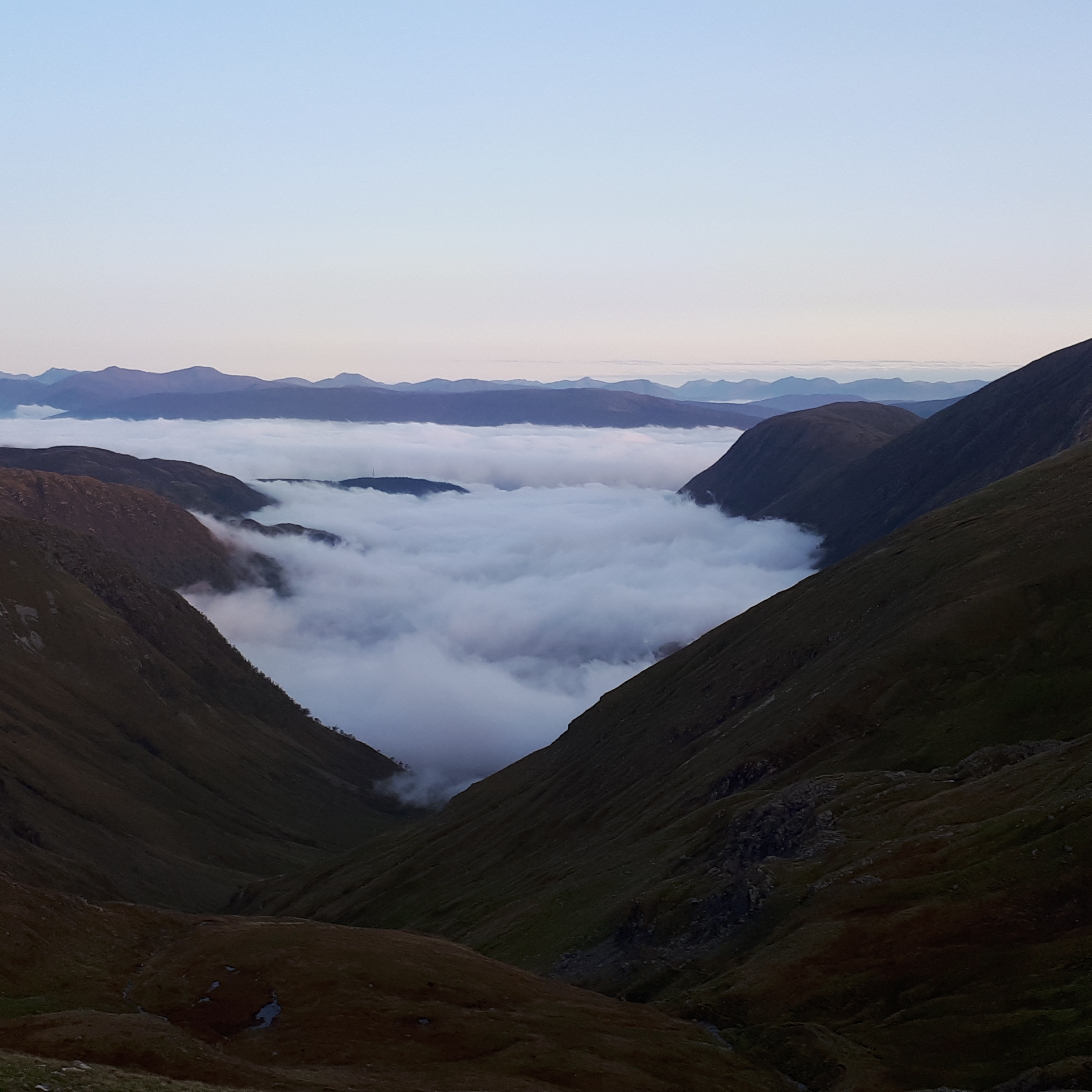 I was on top of Sgurr Eilde Mor by 7.30am and watched the sun rise above a layer of cloud sitting in the valleys. The highest Glencoe hills stuck their heads out above the clouds and to the north I could see Ben Nevis and my next destination, Binnean Beag. One Munro done, nine to go.