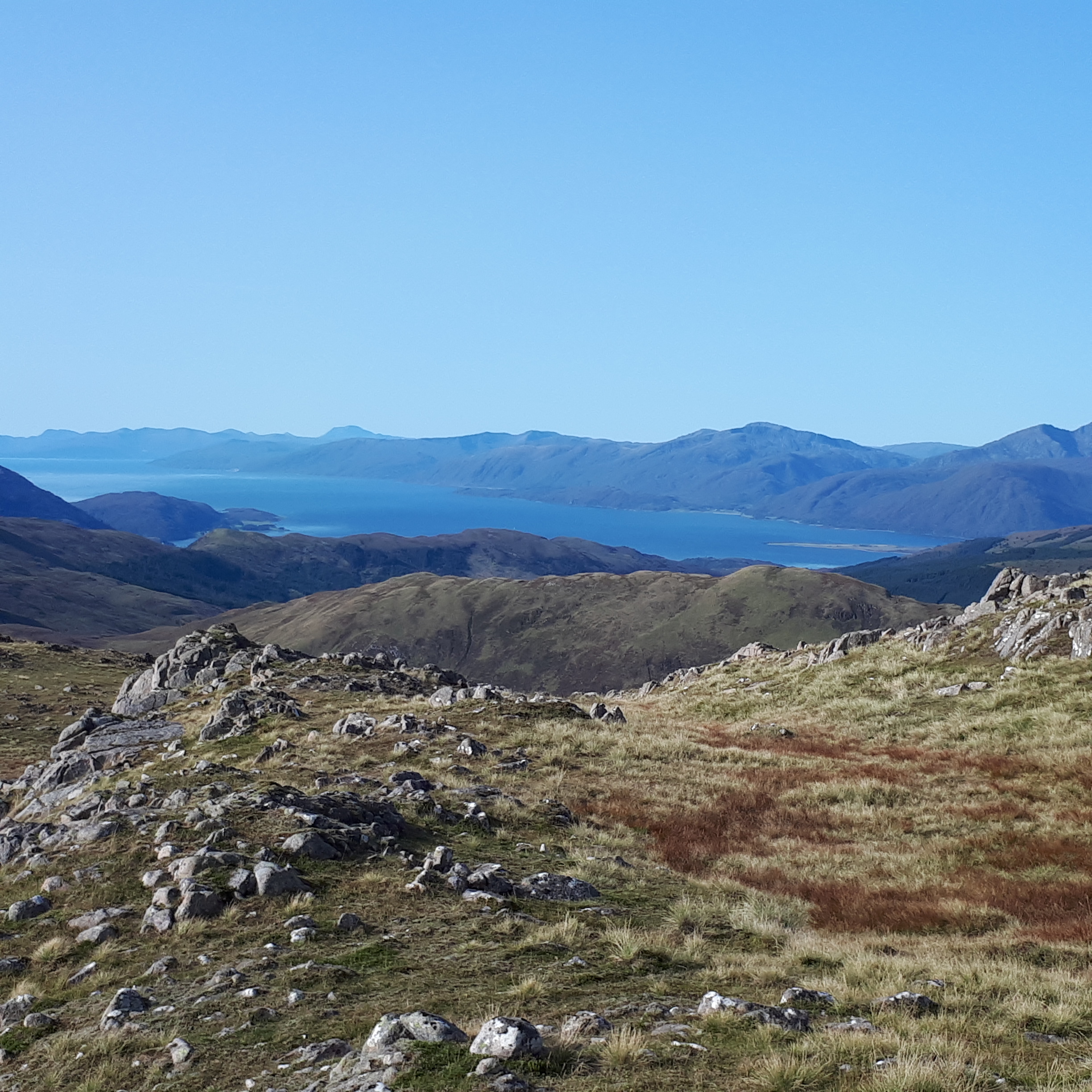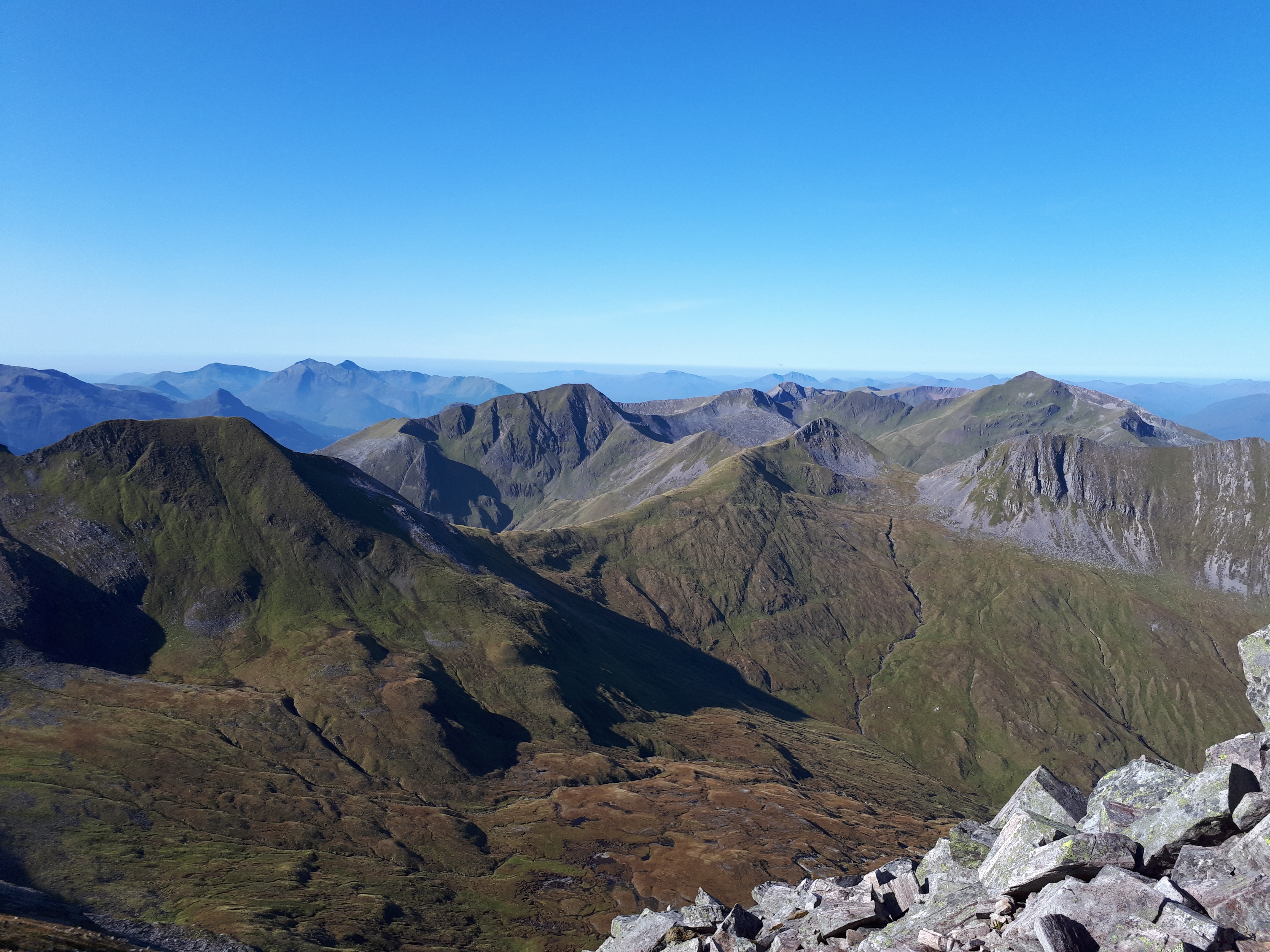 Binnean Beag was soon climbed and then I turned my attention to Binnean Mor. This was the highest of the 10 Munros and the start of the main ridge. The main route goes up the north ridge but this looked like hard work and the east ridge looked better from my vantage point on Binnean Beag. By now it was a glorious day, with a hot sun shining from a deep blue sky and I could see for miles. So I went up the east ridge, easy scrambling over rough ground with no path. Nothing too technical and I was at the summit for 11am where I met the first people I had seen all day.