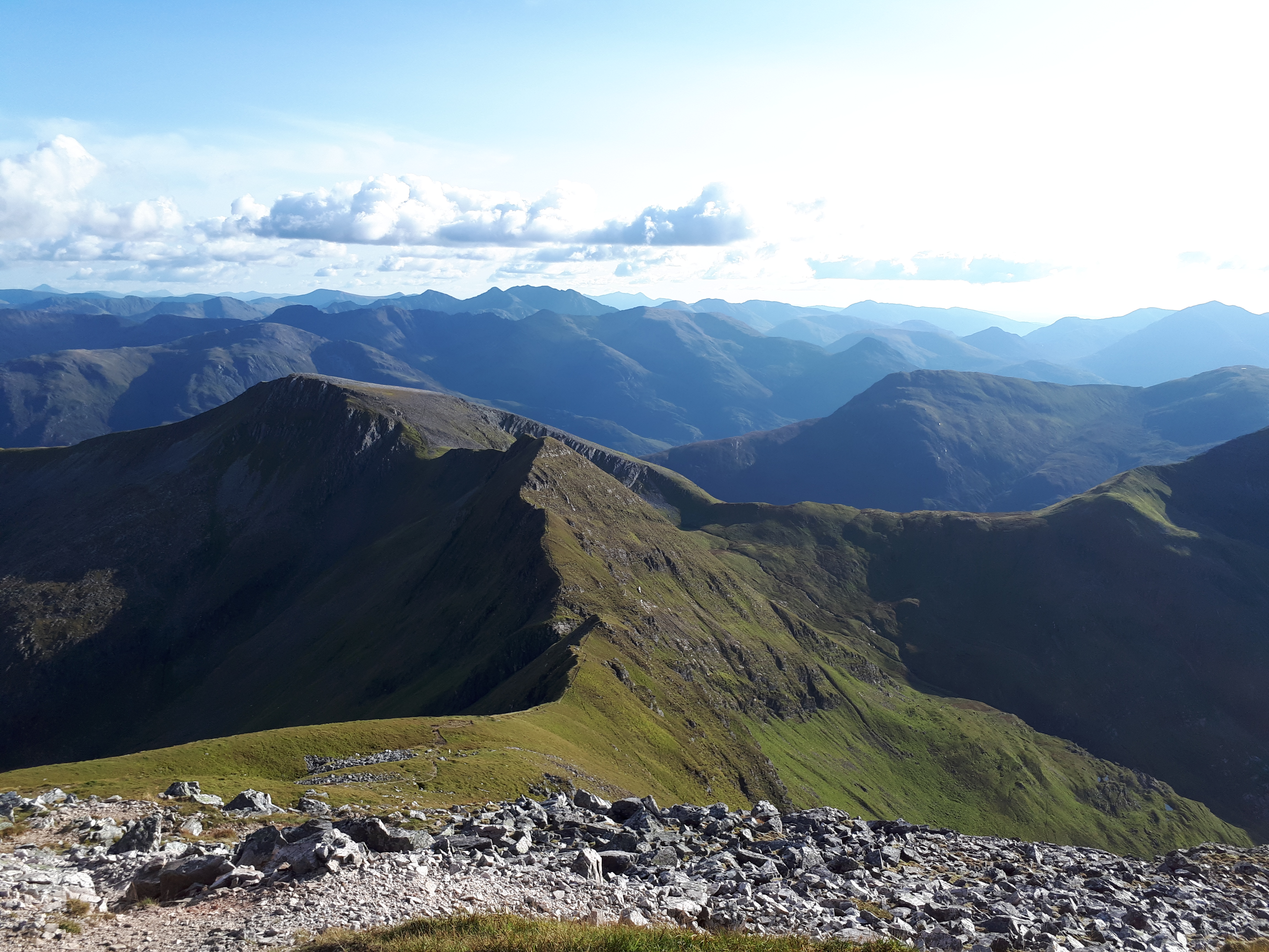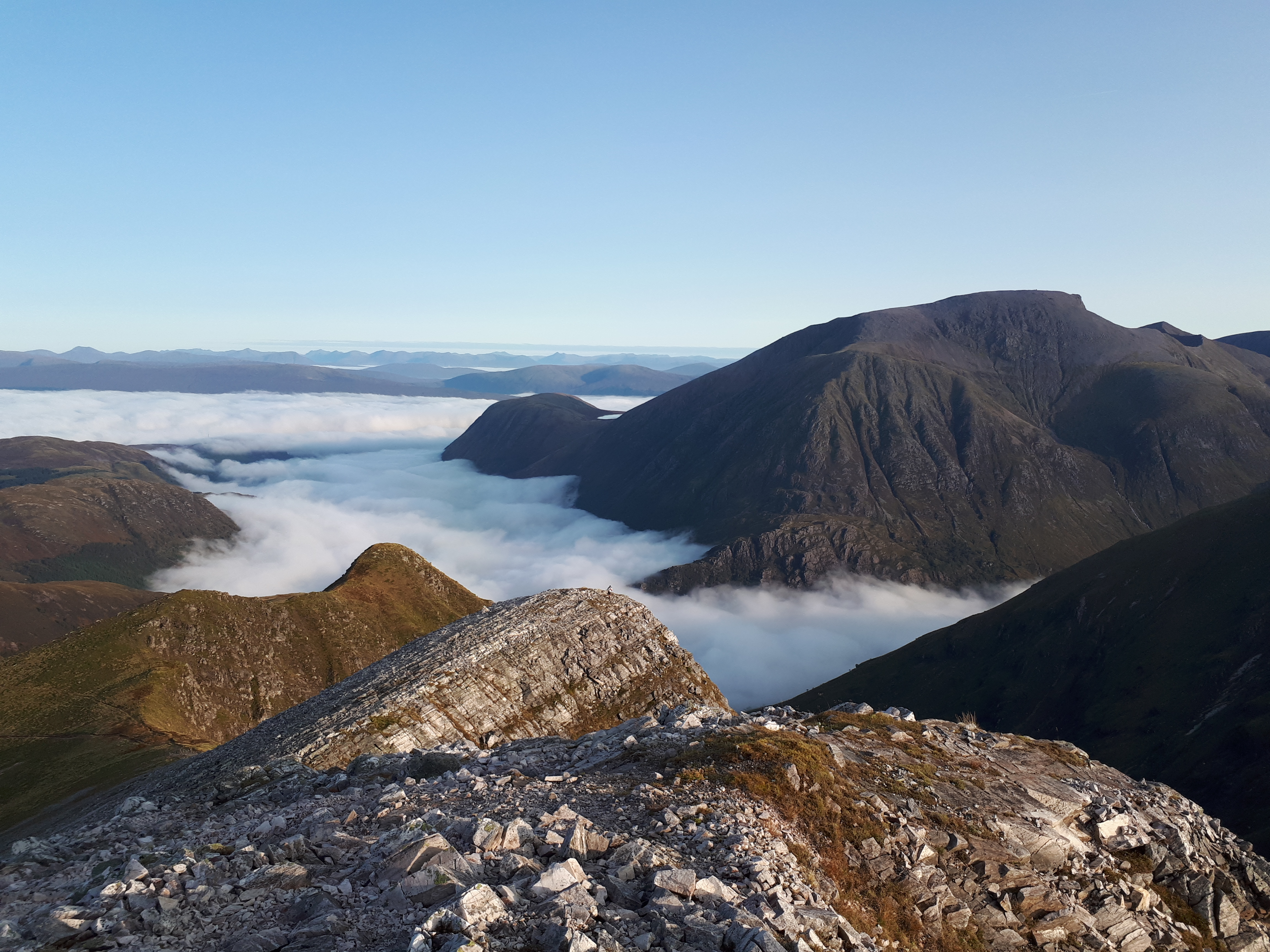 Next morning was clear and dry with a beautiful cloud inversion over Glen Nevis. I only had 2 Munros and 450m of ascent to do today and I was feeling remarkably fit after the previous day. The path up Stob Ban was steep over huge quartzite blocks but the view from the top was magnificent with Ben Nevis appearing over the tops of the clouds. A truly great weekend to be in the hills.