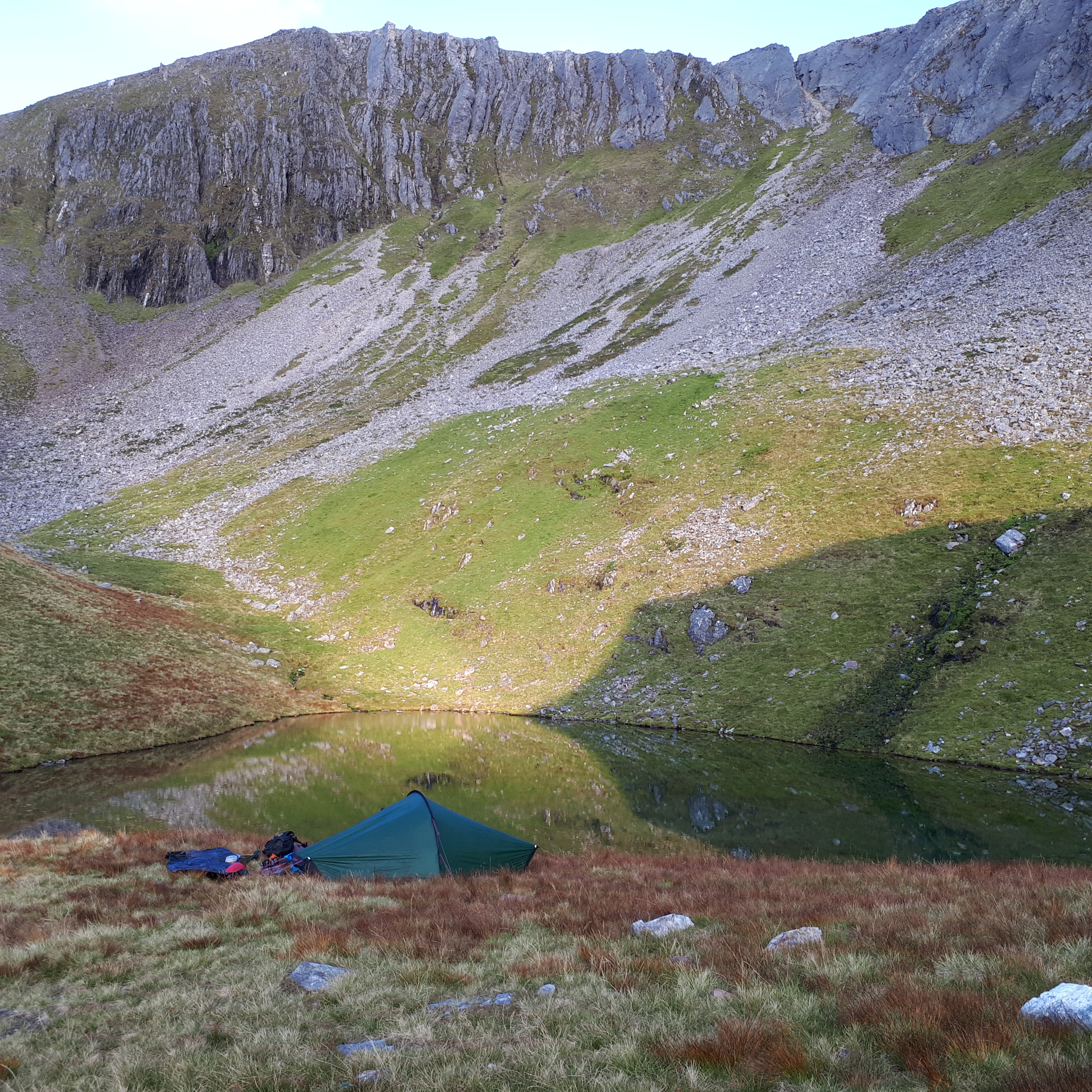 I hadn’t felt particularly tired so far, but the next Munro, Am Bodach, was hard work. It was steep, rocky and loose and I needed a rest at the top, but the end was in sight. I left my rucksack on the col after Sgurr an Lubhair and started out along the Devils Ridge. This was a narrow grassy ridge, nothing too technical but very exposed. I reached Sgurr a Mhaim, the 8th and last Munro of the day, then turned round and retraced my steps along the ridge to my rucksack. All that remained was to drop down to the Lochan where I was planning on spending the night. I reached camp at 5.30pm after 10 hours of walking and 2200m of ascent.