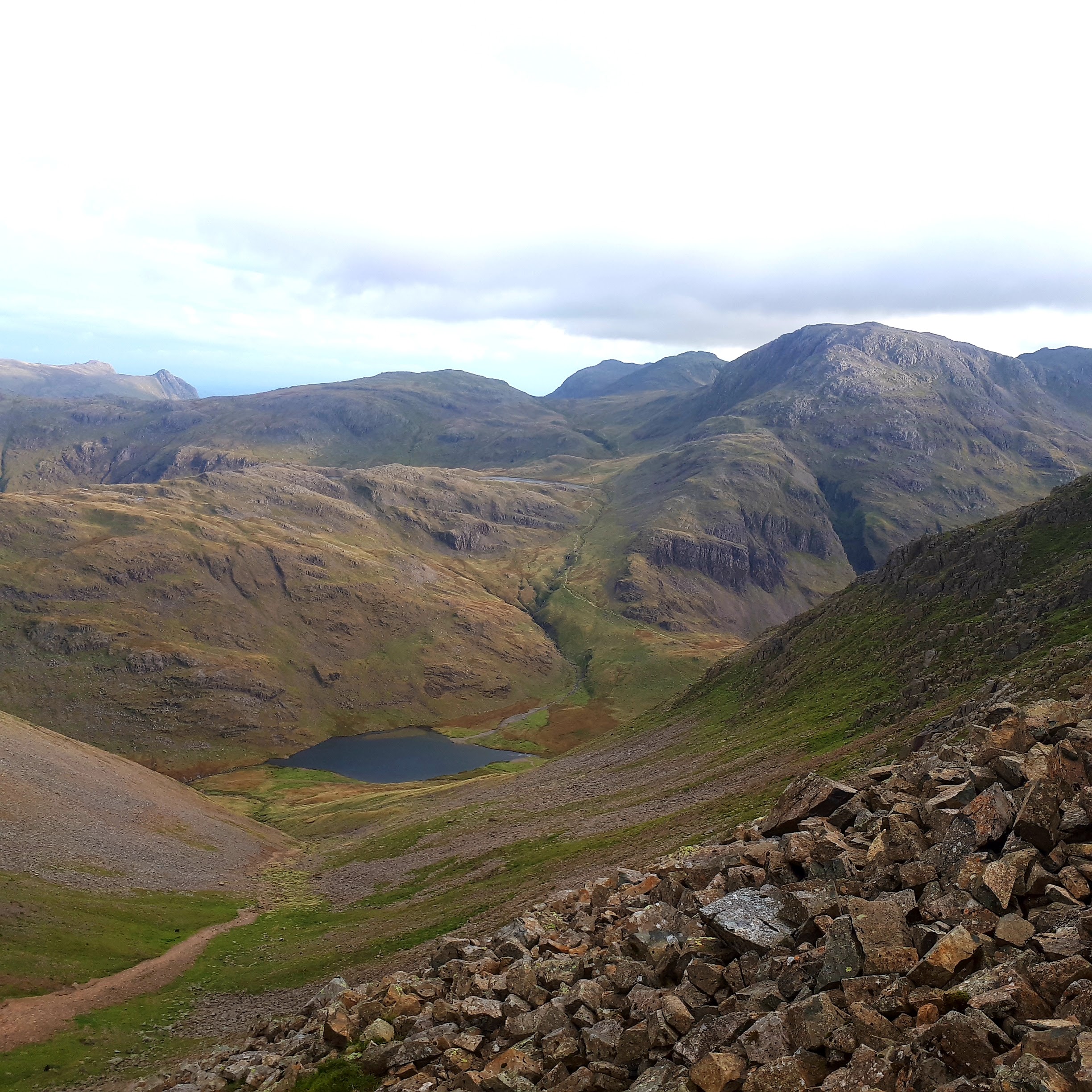 After Pillar is the long and gradual descent to Black Sail Pass with views down to Wasdale Head and Wastwater. The wind increased at this point and I was blown about on the steep and scrambly ascent of Kirk Fell. Just after the top of Kirk Fell I stopped to take some photos and I happened to turn around and look back along the path I had come along. There, 100m back along the path, was half of my tent where, unknown to me, it had fallen off my rucksack. What chance thought made me look back at that point? I could so easily not have noticed until much later and then I would have had to retrace my steps, possibly in the dark.