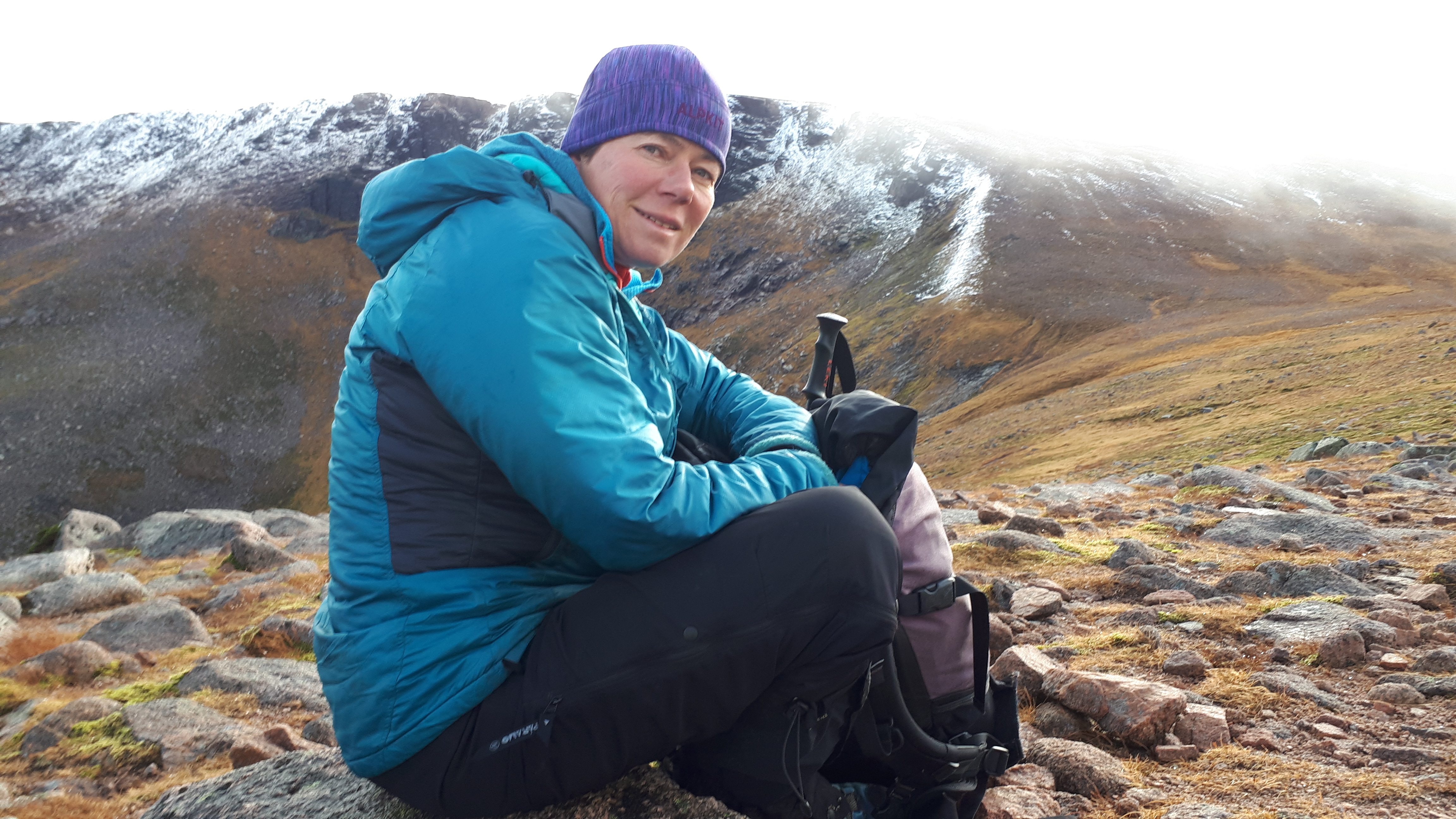 After Stob Coire an t-Sneachda it started to snow heavily and visibility worsened. I asked Hannah to put on her coat and she refused. I’d have done better asking her to take all her clothes off as she often does the opposite of what I ask her to do. Envisaging hypothermia I was more forceful. She sulked, told me she hated me but put her coat on. I tried to get her to eat something but of course she refused that as well. How I am looking forward to her being a teenager š.