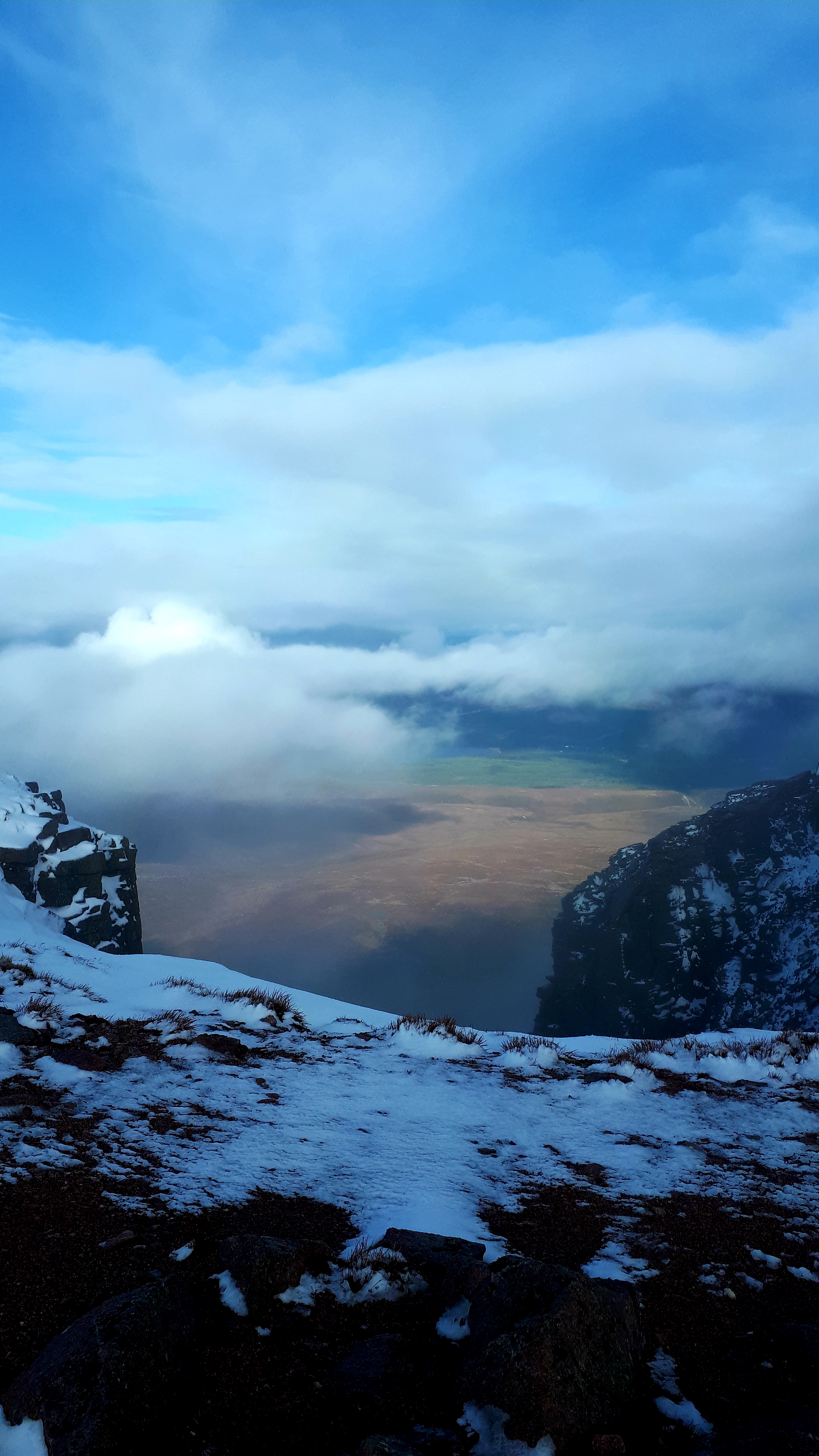 The path up towards Cairn Lochan was gradual and easy to follow. The snow line was at 1050m and we lost the views at that point as well. There was a cold north westerly wind but we had plenty of warm clothes and spare hats and gloves. I also had our crampons but the snow wasn’t quite hard enough to need them much to Hannah’s disappointment. She likes wearing crampons. We stopped for food and hot chocolate at the top of Cairn Lochan then followed a compass bearing along the edge of the plateau, taking care to keep away from the edge. So far so good.