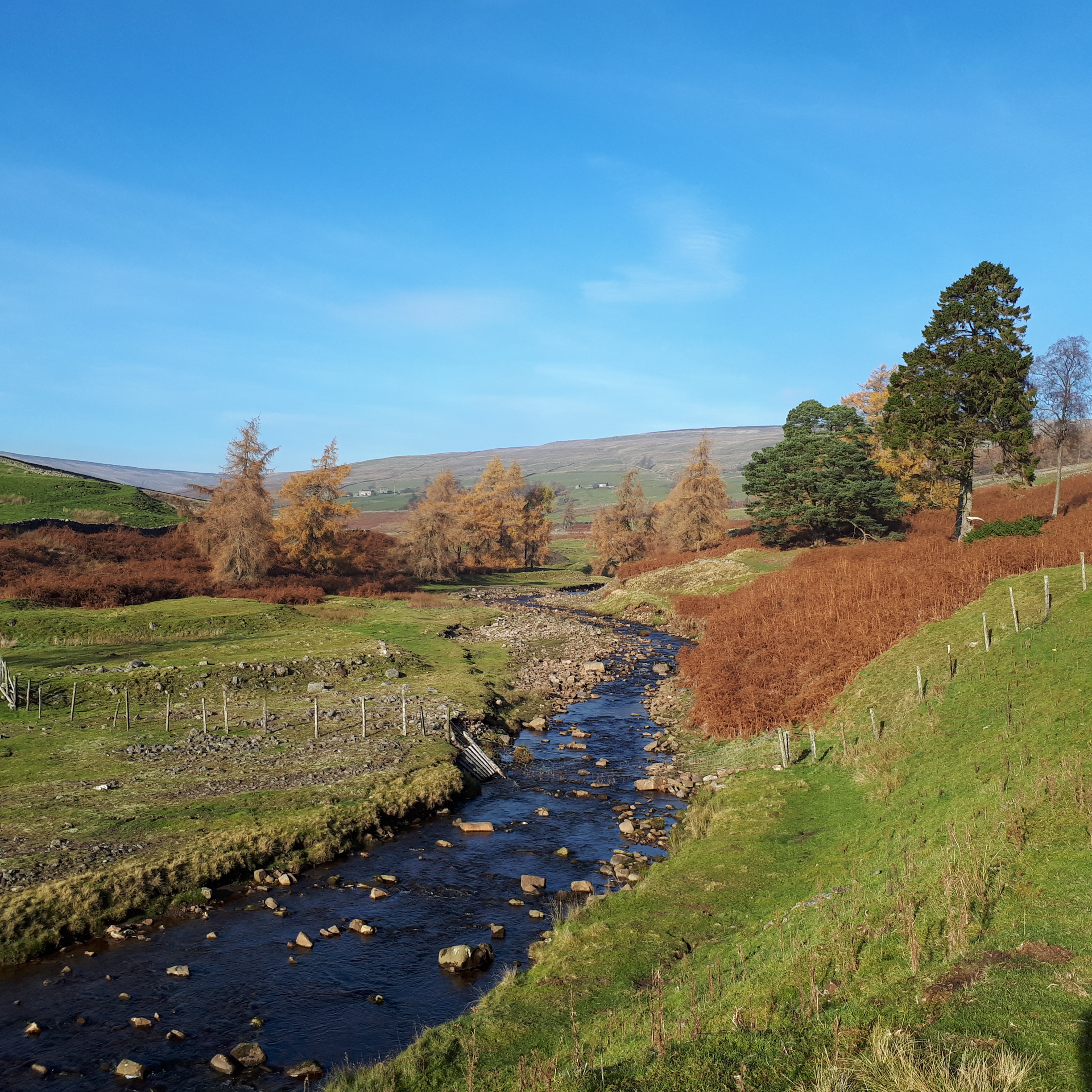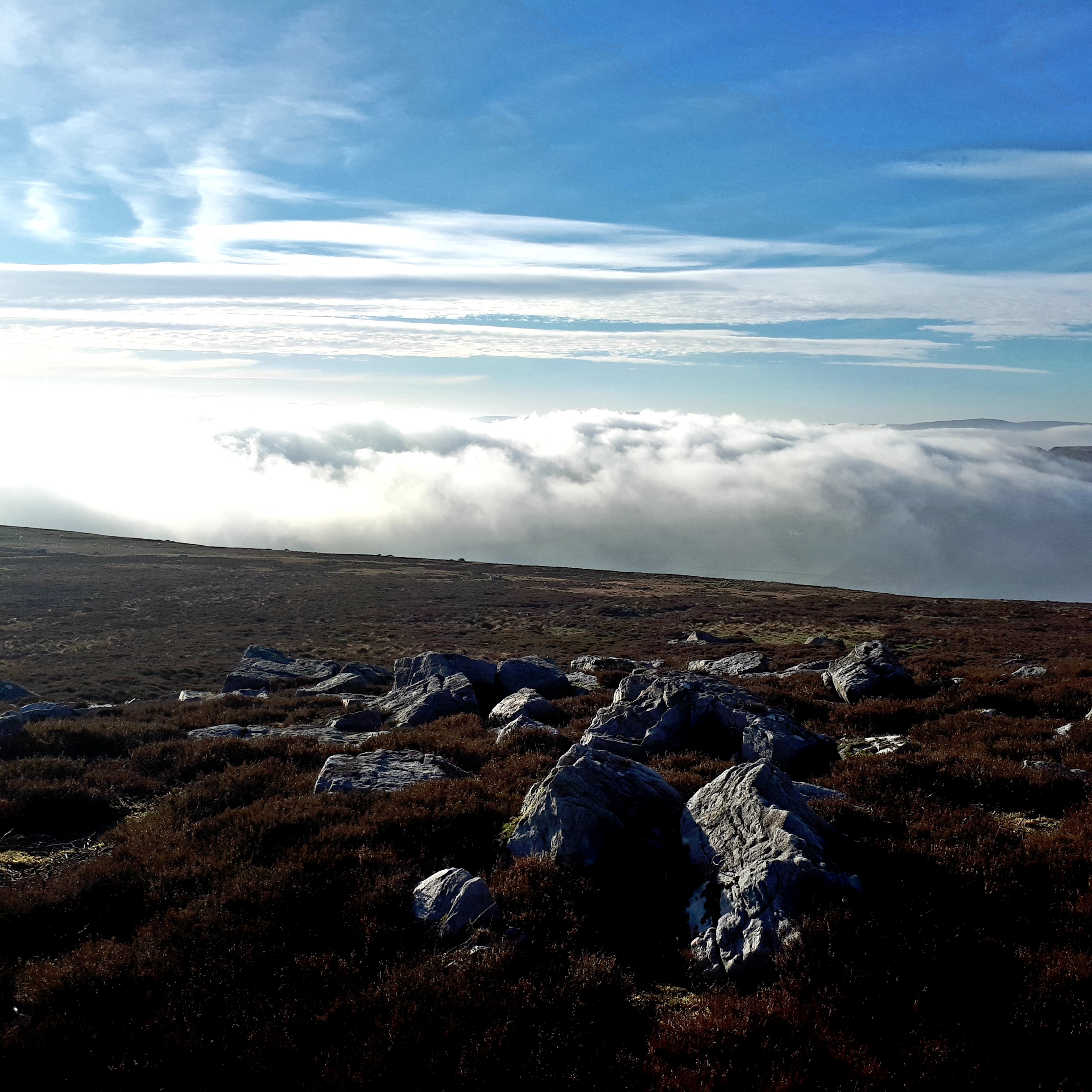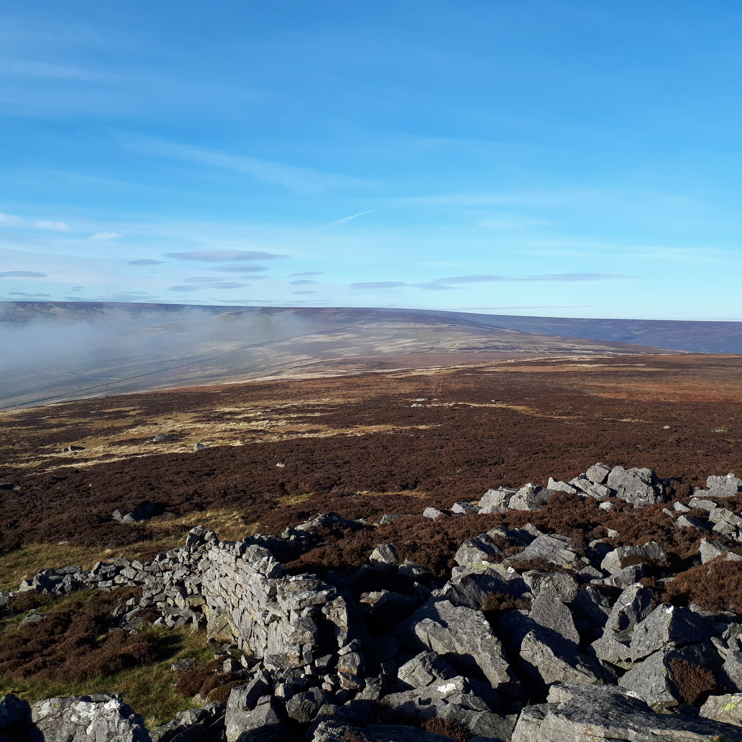Friday morning was foggy yet the forecast promised better weather later so after a few hours’ work I headed out to Monks Moor above Middleton in Teesdale. Driving up to Snaisgill I came out of the cloud and into glorious blue skies with the sun shining on the moors. I ran down through the trees and along Hudeshope Beck before climbing steeply past the old mine remains at the end of the valley. The air was clear and the autumn colours contrasted against the clear blue sky. After the mine workings I turned south over open access land following a vague track towards the summit of Monks Moor. The cloud was slowly drifting up the Hudeshope valley but I stayed above it and was rewarded with a superb cloud inversion. I sat for a while on the summit in the warm November sunshine enjoying the view over a sea of cloud before heading down into the damp, cold mist and back over the moors to Snaisgill.