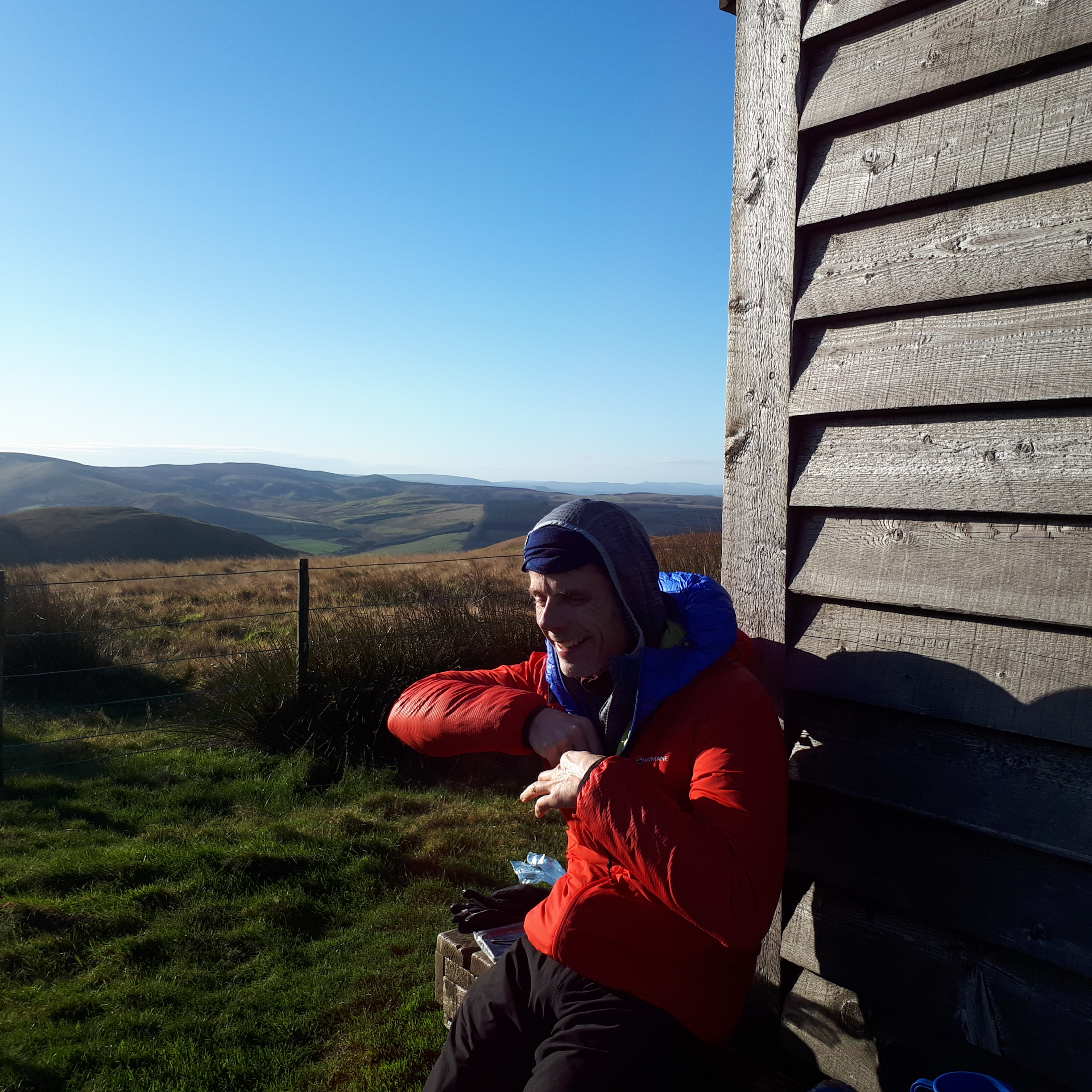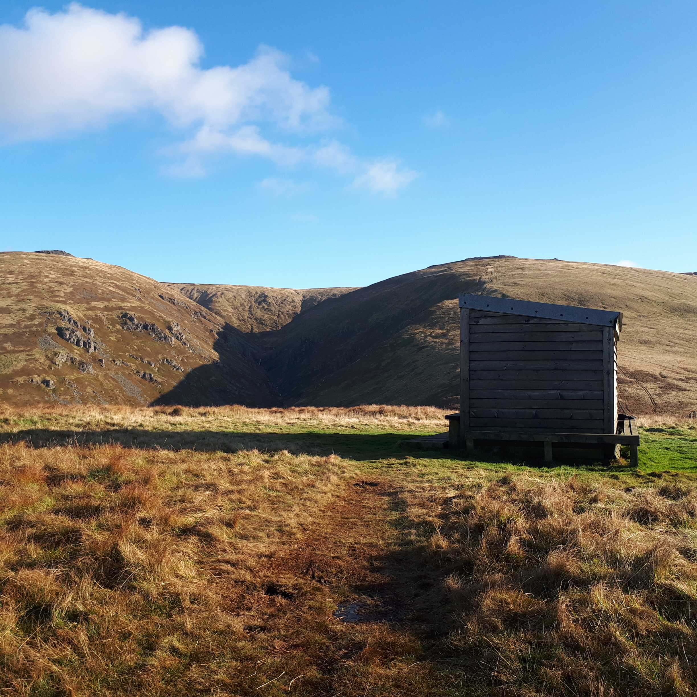 On the skyline we could see a small black building that was our lunch spot. Half an hour later we reached the Auchope Mountain Refuge, a tidy little hut with a few benches and some old sleeping mats. It would be a great spot to spend the night. I had my stove with me so made a cup of tea and we spent a very pleasant half an hour sitting in the sun and drinking tea, sheltered from the wind by the back wall of the hut.