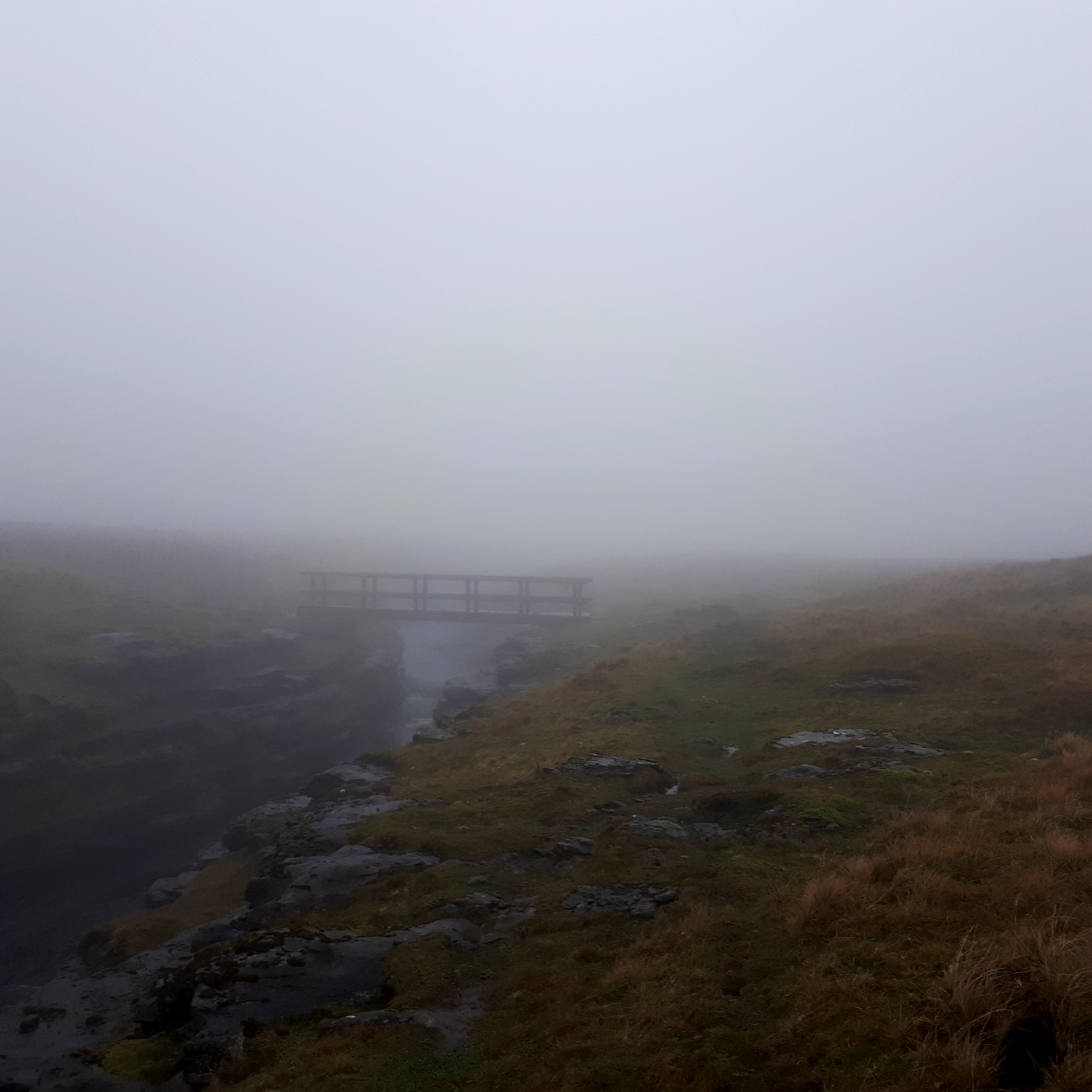 We took another compass bearing down over pathless moorland to the Pennine Way and as far as the footbridge over Maize Beck. It was 1pm and I had my daughter to collect from school in Barnard Castle at 4.30pm so we didn’t quite have time to reach High Cup Nick. Not that we would have had a view, although the rain had eased slightly.