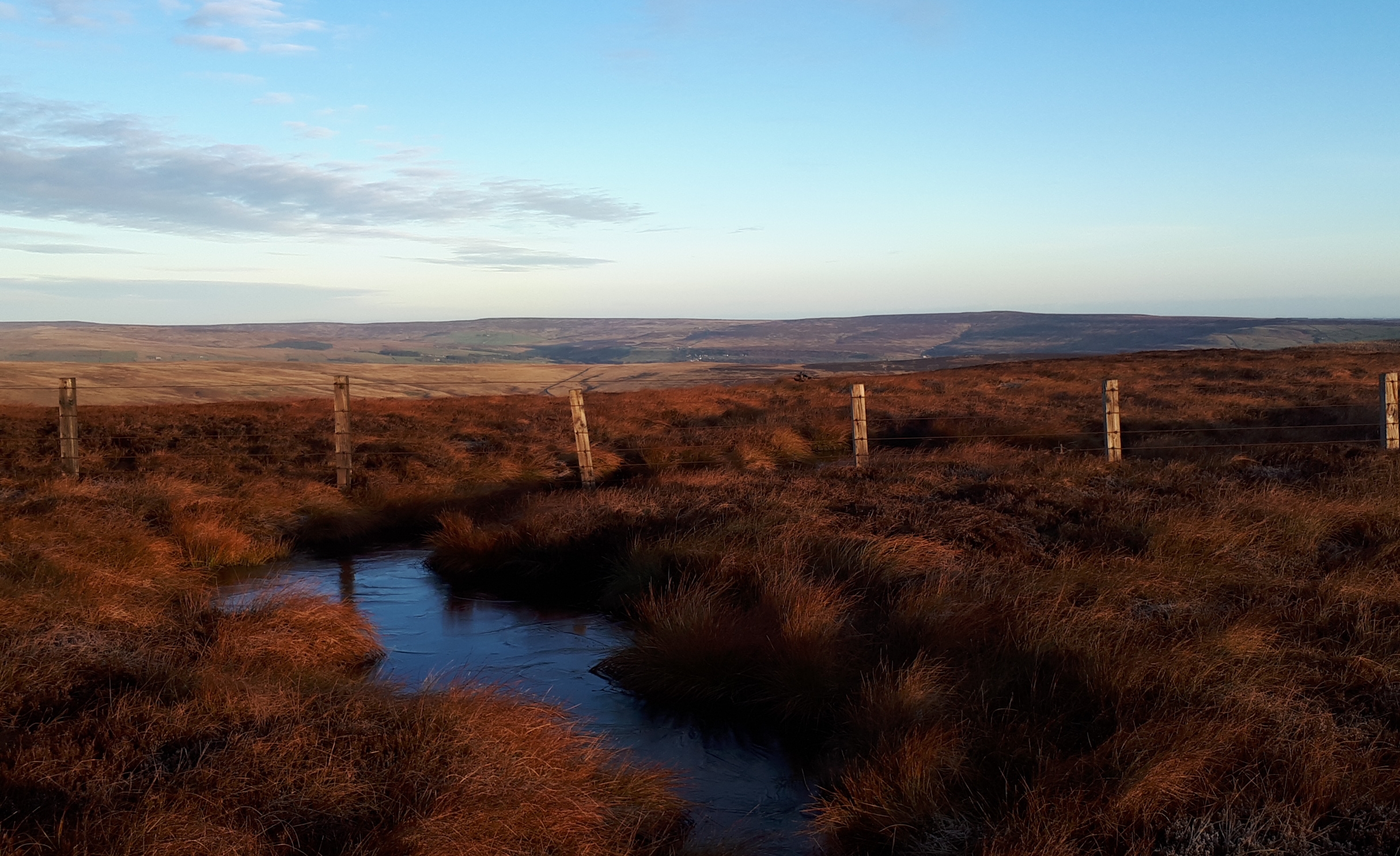 It was a beautiful morning on Tuesday and the pull of the hills was strong, so strong that I didn’t take the usual turn for the office but kept on driving with no idea where I was going. I ended up at the top of the Eggleston to Stanhope road, Teesdale on one side and Weardale on the other. The air was cold and clear with a sharp frost on the ground and the sun was climbing slowly into a blue sky. I walked for an hour over frozen moorland along the watershed to Harnisha Hill, wrapped up well against the icy wind. I returned the same way and having sated the call of the hills, drove back to the office.