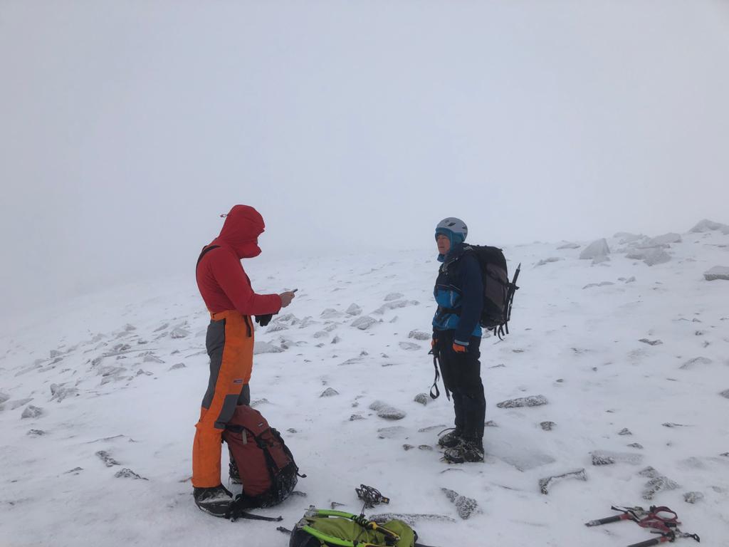From there it was a short distance to the final rock pitch and the top. It was Jakob’s turn to lead and he found it hard, almost falling off at one point. But he made it, and I followed, using only one axe and leaving my other hand to grip rock. As a result I climbed better and didn’t struggle too much. Then Jim shouted that one of his crampons had come off and had fallen down the gully to the climbers below. He would climb the pitch with the remaining crampon and wait for the climbers following to bring up his other crampon.
