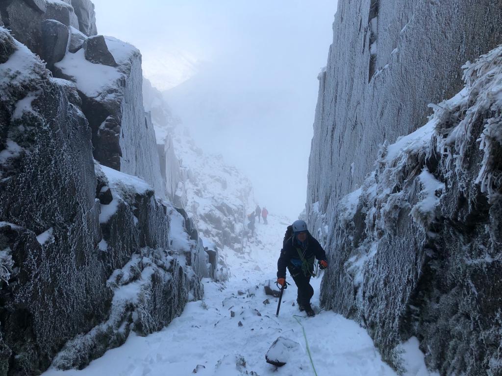 The next destination was Custs Gully but finding it was a challenge in poor visibility. It wasn’t obvious from the map which of the many black lines signified Custs Gully and the topo in the guidebook seemed to bear no resemblance to what we could see. There were quite a few other people wandering round also looking for Custs Gully so I expected it to be busy assuming of course we ever found it. But by trial and error we eventually found it, and we roped up again. The mist was starting to clear and the huge chockstone loomed above our heads further up the gully. The first part was easy scrambling so we just moved together to save time.