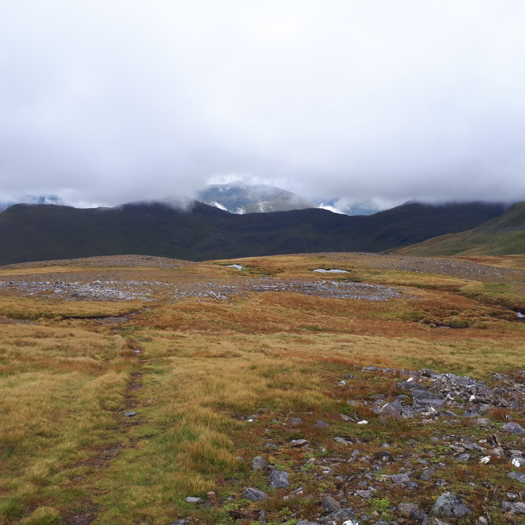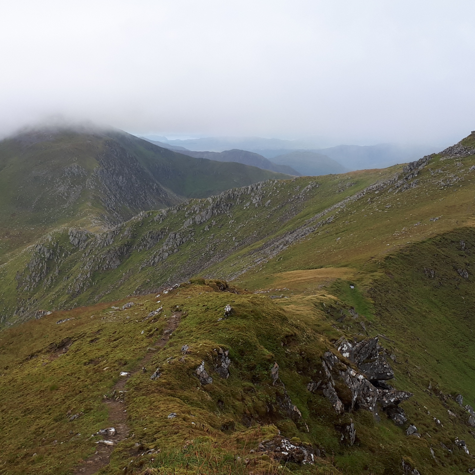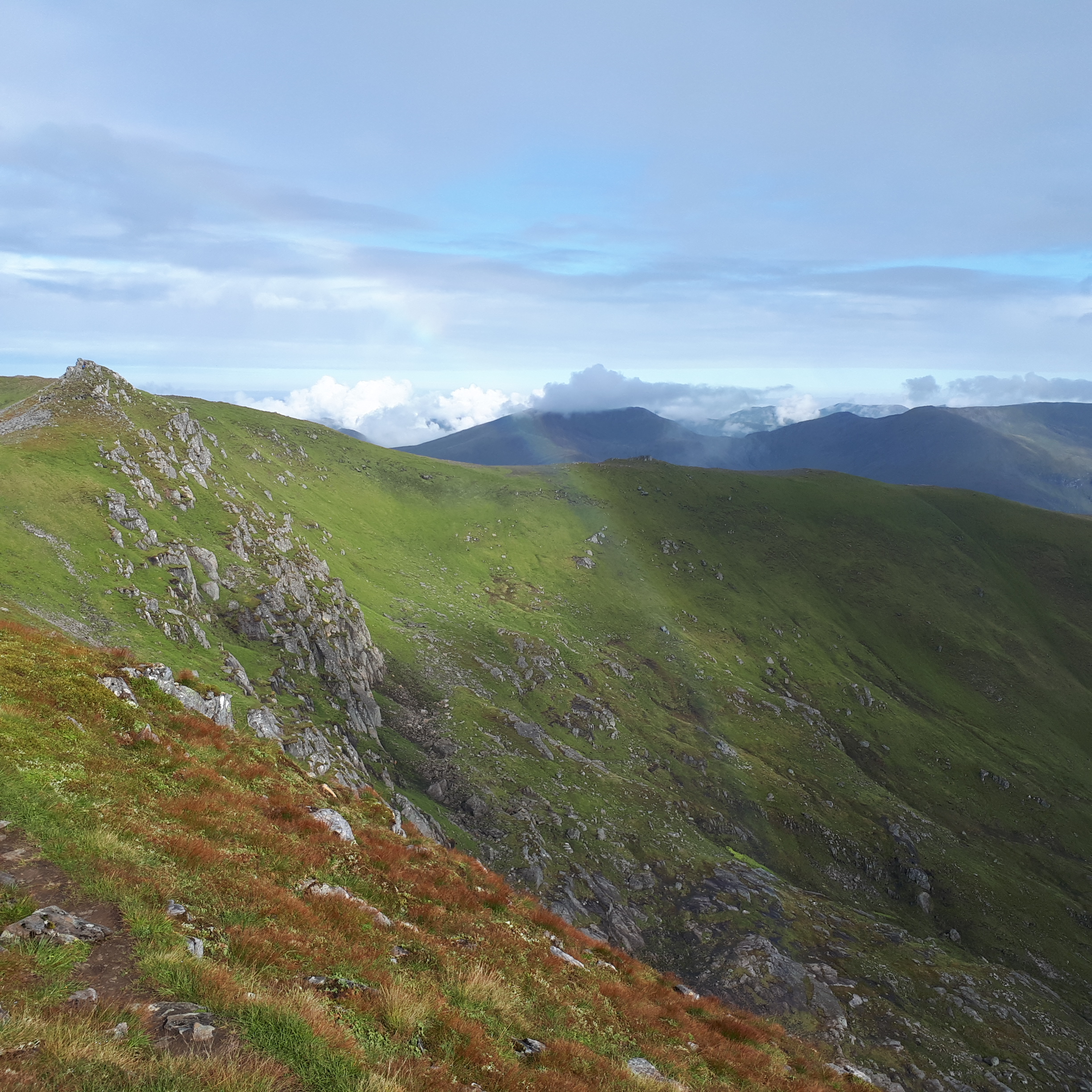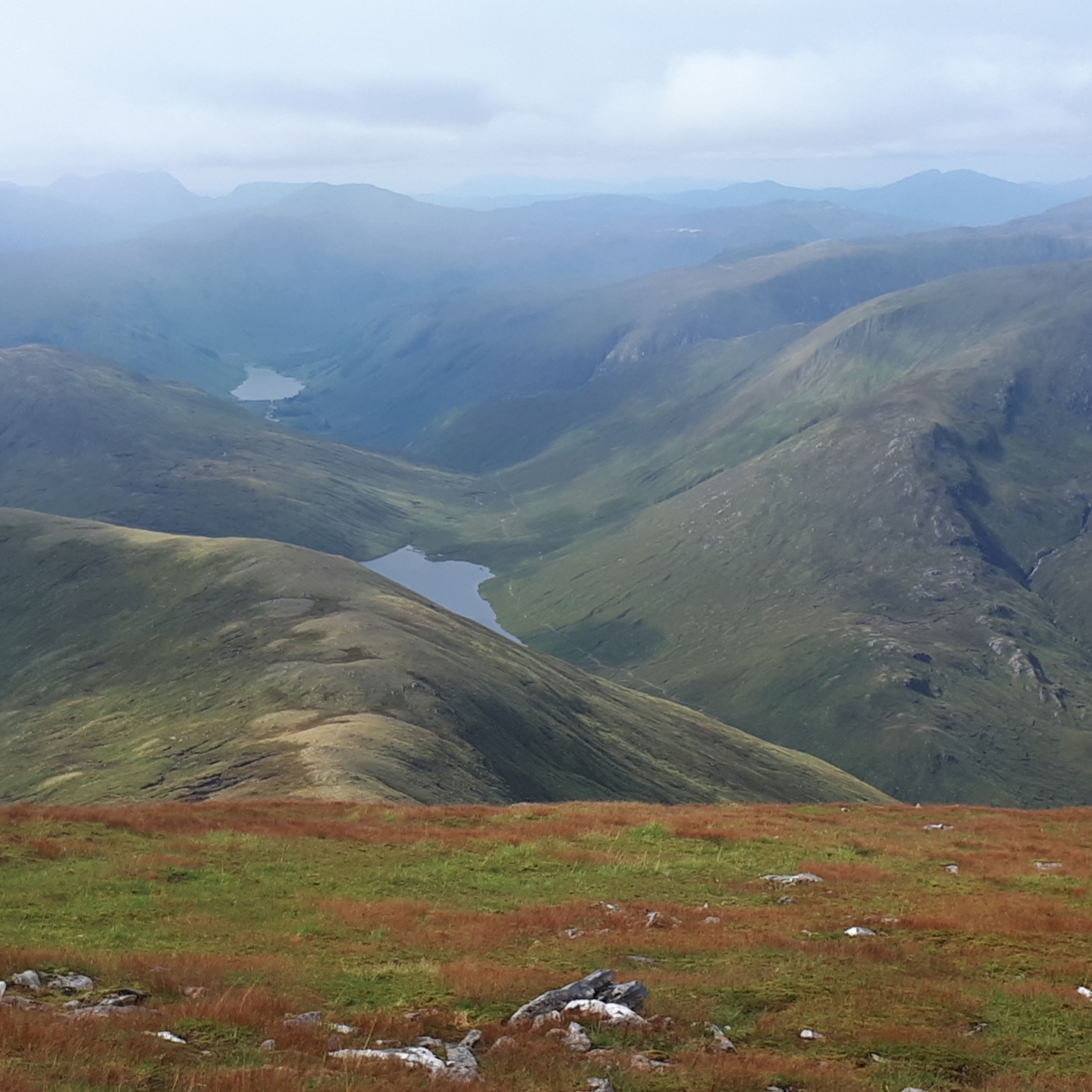 Day 2 5.17pm: Day 2 has gone well. Weather was damp with low cloud to start with but cloud lifted and the tops have been clear for most of the day. No sun, bit of a breeze and fairly cool, so perfect. Really wild walking along narrow ridges, saw 1 other person all day, as I was coming down from An Socach, my last peak of the day. Saw 3 huge birds circling around the coire just before An Socach. Definitely not buzzards, much bigger than that with patches of white on the underneath of their wings and completely silent. One circled right above me and watched me carefully, probably trying to decide if I was a threat or not. For a moment I wondered what it would do next, then it flew back to join its companions and they all soared high into the sky and disappeared. Could they have been eagles? Just the sort of place eagles might live. Amazing to see 3 of them at once, just me and them high up on the ridge.