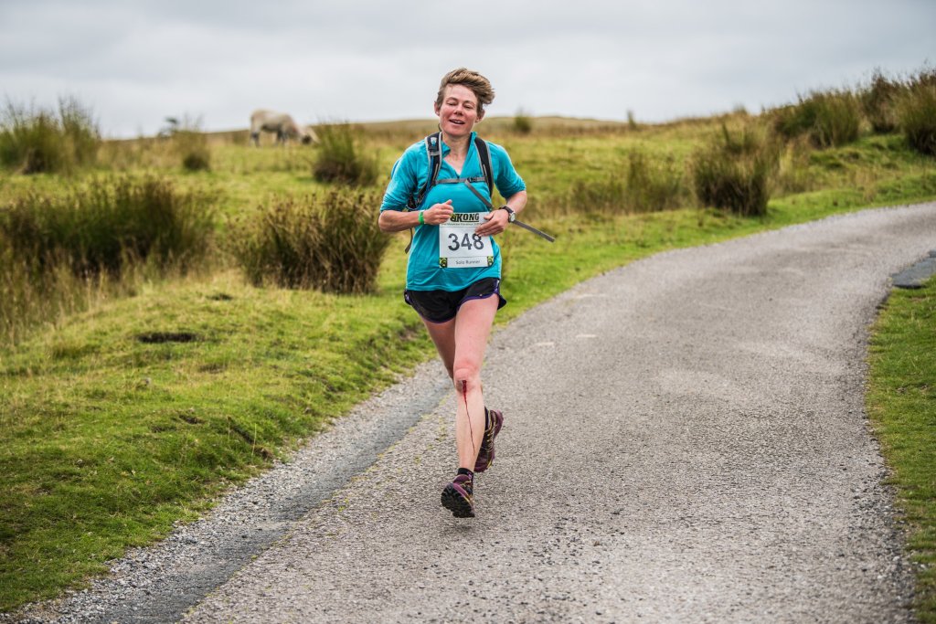 I decided to go for the optional checkpoint. Another descent and reascent followed, the last of the day, followed by 2 checkpoints in quick succession. I had half an hour left and over 4km to go, mostly down hill, mostly over rough ground. I wasn’t sure I was going to make it, but I was going to try. Then disaster struck. I was flying down a steep gravelly track with 15 minutes to go when I tripped up, fell heavily and went down with a bang. It hurt. But I had no time to waste so I jumped up and carried on, ignoring the blood running down my leg and the pain in my knees, chest, hand and elbow. I rounded one final corner and there was the finish. I had 3 minutes to spare.