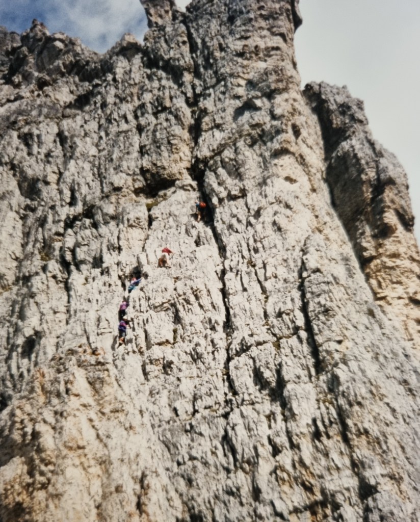From there it was another bus ride, this time into the Gschnitz valley and the Stubai mountains. Another night at a B&B and then the next day the sun returned for a steep 3 hour climb up to the Innsbrucker hutte. There is a good klettersteig (via ferrata) there on the Ilmspitze and in the afternoon we wandered along to the bottom of it as I’d never seen a klettersteig before. A group of Italian men were about to start up it and seeing us look at it they asked in broken english if we wanted to go up. Margaret said no, but I jumped at the chance. One of the older Italians who seemed to know what he was doing produced some slings and karabiners from his rucksack and improvised a chest harness for me. I had no helmet. Looking back I realise how dangerous it was. Had I fallen the sling would not have been able to absorb the impact of the fall and would have snapped – that’s if I hadn’t already been hit on the head by a rock. But with all the confidence and ignorance of youth I followed the Italians up the klettersteig, not understanding a word they said to each other in Italian. At the top the schnapps was passed round and we started the long and loose descent back to the hut.