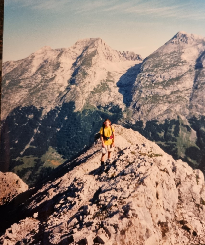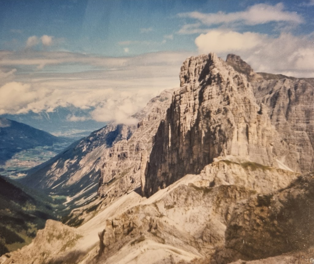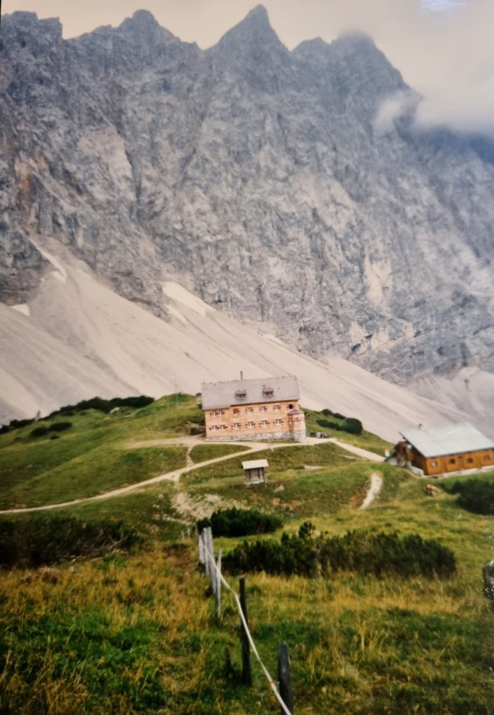 In August 1994 I spent 3 weeks walking from hut to hut in Austria with Margaret, a university friend. We were both 21. We started in Mittenwald on the Austrian-German border and headed east into the Karwendel mountains, a range of limestone peaks north of Innsbruck. It was a baptism of fire, with huge ascents and descents with rucksacks that were far too heavy. We crossed from Germany into Austria and back a few times and stayed at the Mittenwalderhutte, the Hochlandhutte, Karwendelhaus, Falkenhutte and Lamsenjochhutte. The walk from the Hochlandhaus to the Karwendelhaus was long and hard, so we had two nights at the Karwendelhaus and climbed the Odkarspitze and Birkkarspitze, both about 2750m.