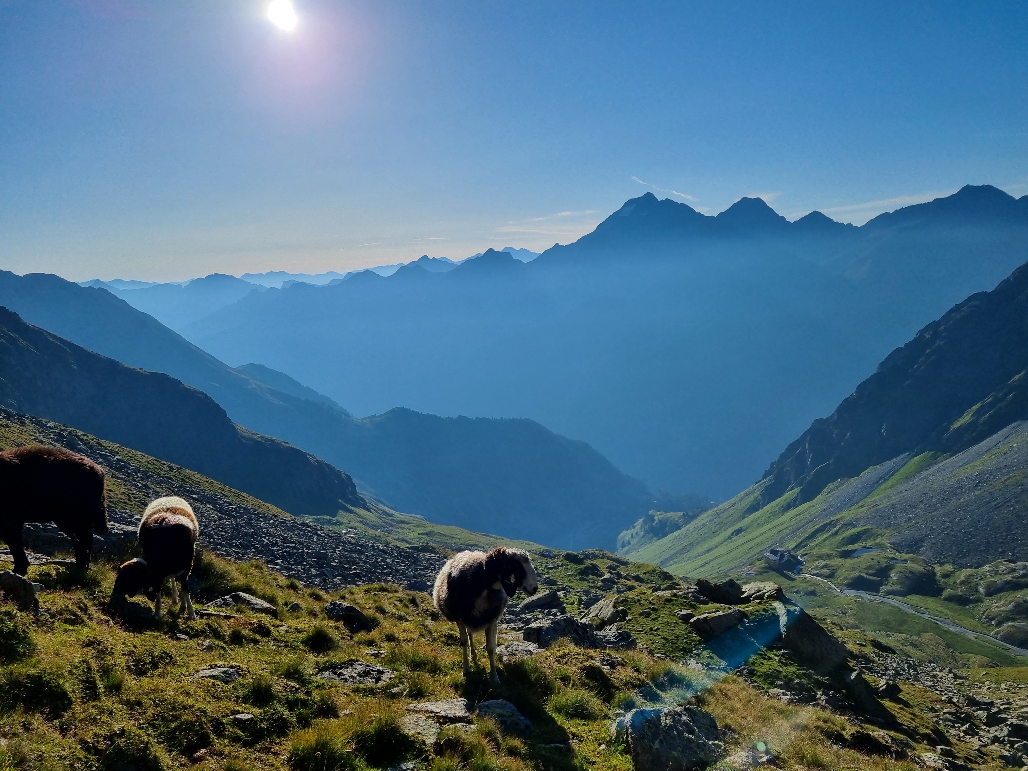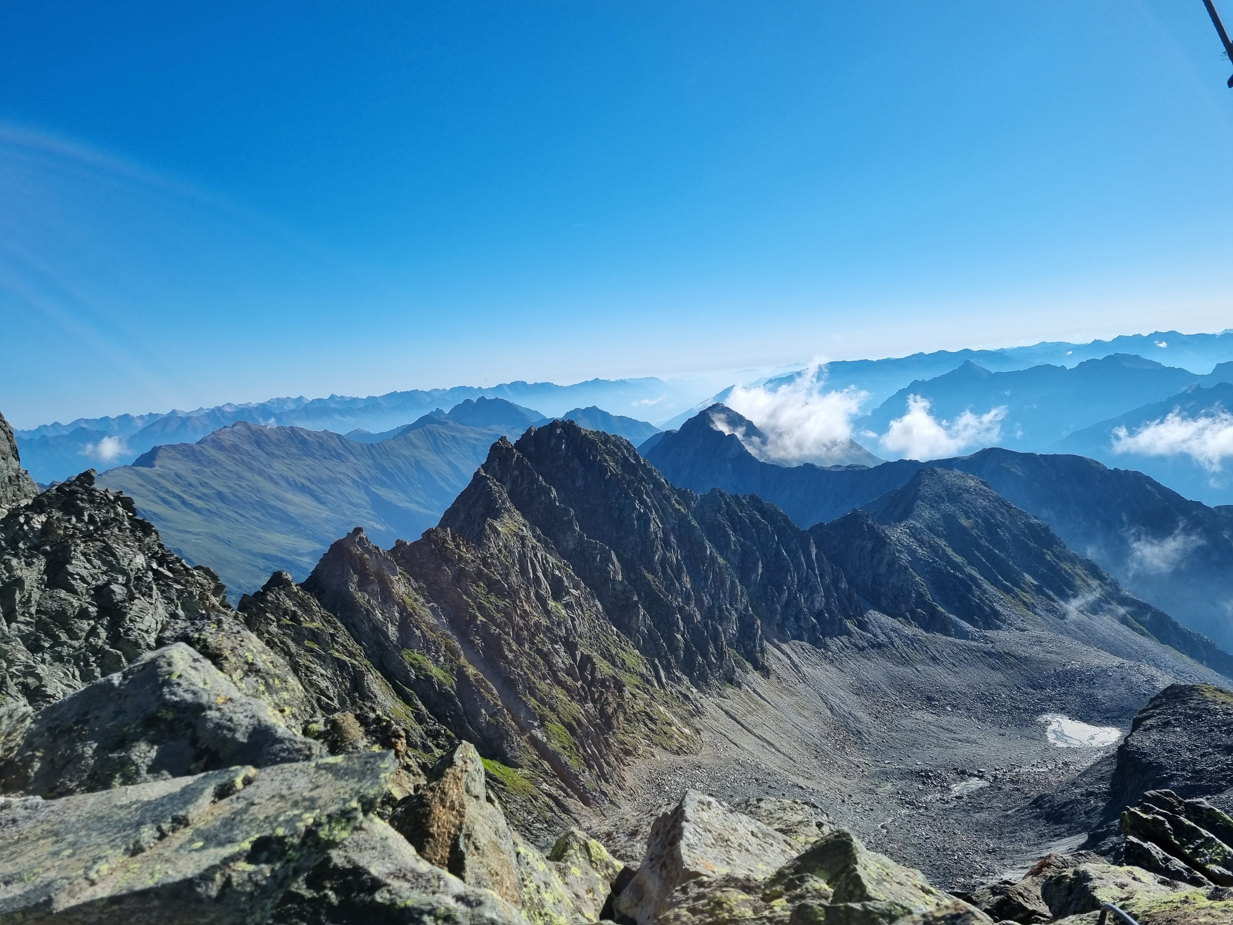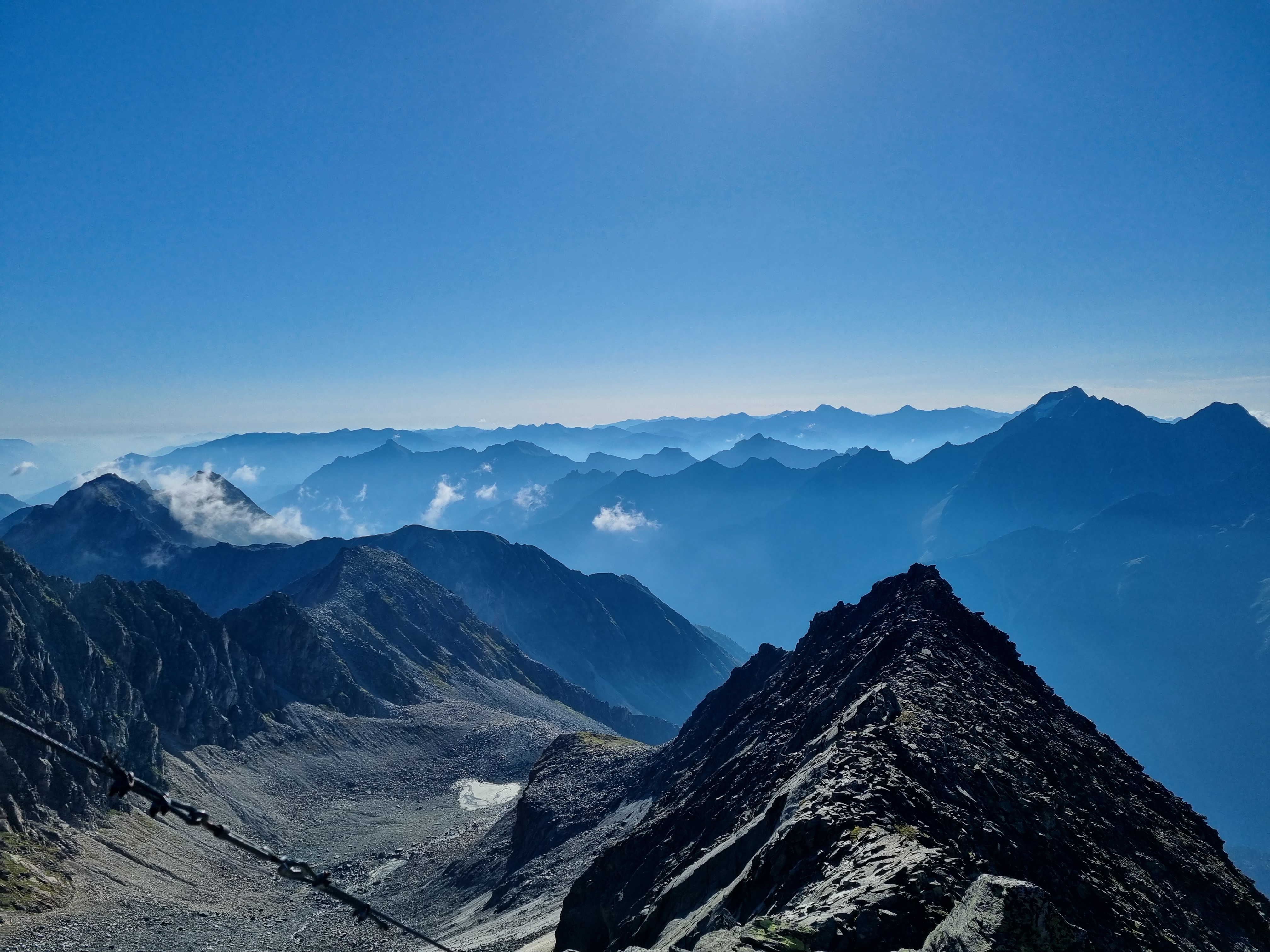 I sat for a good hour on the summit, enjoying the gentle breeze and warm sunshine. The mountains in the distance were a dark blue, first the Stubai peaks and then, further away, the Dolomites. I had the summit to myself and there was no noise apart from the odd alpine chough and the faint sound of a mountain stream far below.