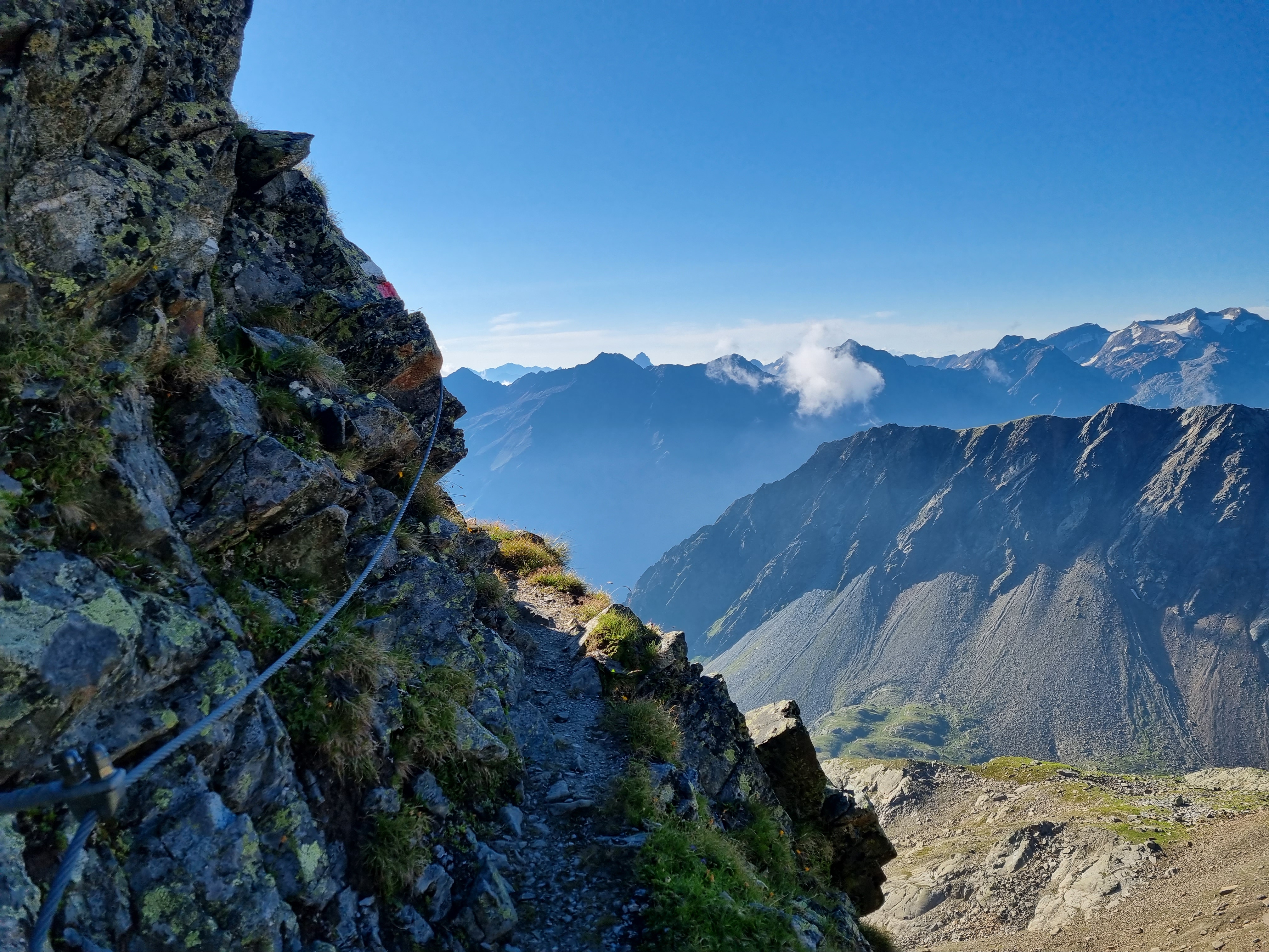 The path got rougher and led me over glacier rubble to the base of a large cliff. It seemed improbable that the path would go up here but go up it did, zigzagging its way along narrow ledges, often with a wire cable to act as a handrail. No real scrambling but a stumble off the edge of the path would mean certain death. The last 50m of the ascent involved easy scrambling over large granite blocks and suddenly, there was the summit cross.