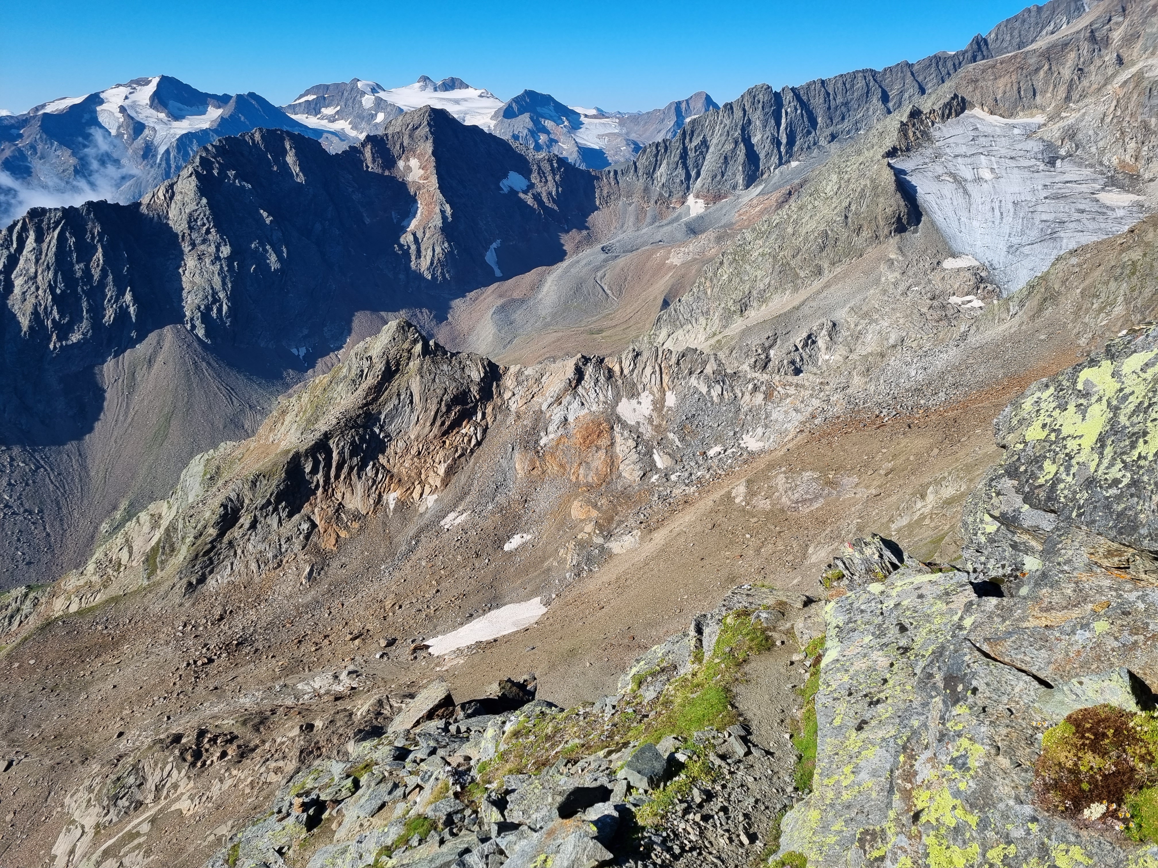 I had an early start the next day, with breakfast at 6am and walking by 6.30am. It was already warm, even at 2,000m, and the sun shone out of a clear blue sky. I was going to climb the Kreuzspitze, a rocky peak above the hut with a summit at 3,084m and the guidebook time was 4 hours up and down, a nice half day with a light rucksack. Initially the narrow path climbed steeply up grassy slopes above the hut and half way up I heard a loud whistle in the grass to my right. I looked and saw a large marmot running quickly away. The whistle was to warn its friends of impending danger in the form of me. The grass turned to scree and glacier moraine at about 2,700m. There was a small glacier marked on my map here but I was using the map I bought 28 years ago and although the map had stood the passage of time the glacier had not.
